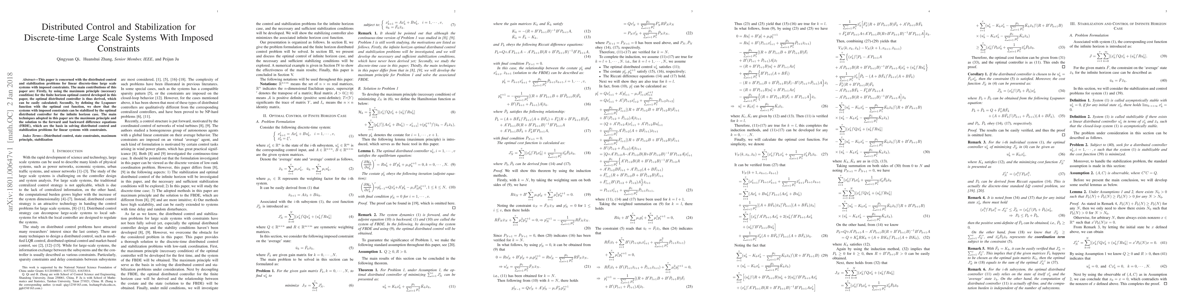 This paper develops an optimal distributed controller for linear discrete-time large scale systems with constraints, utilizing the maximum principle and Lyapunov functions. It demonstrates stabilization for both finite and infinite horizon scenarios using forward and backward difference equations.