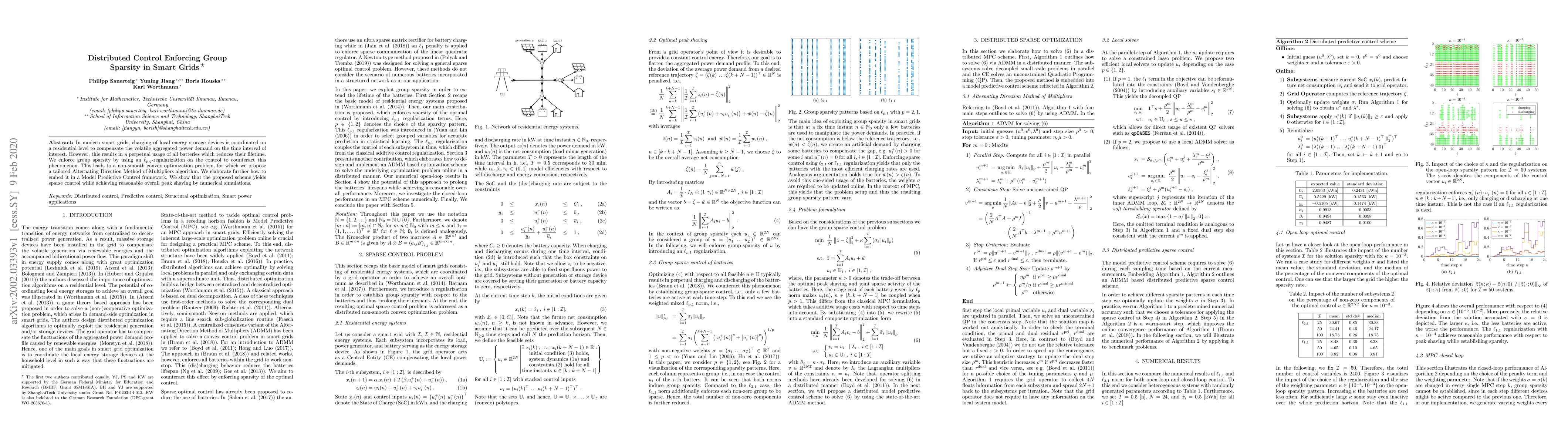 In modern smart grids, charging of local energy storage devices is coordinated on a residential level to compensate the volatile aggregated power demand on the time interval of interest. However, this results in a perpetual usage of all batteries which reduces their lifetime. We enforce group sparsity by using an $\ell_{p,q}$-regularization on the control to counteract this phenomenon. This leads to a non-smooth convex optimization problem, for which we propose a tailored Alternating Direction Method of Multipliers algorithm. We elaborate further how to embed it in a Model Predictive Control framework. We show that the proposed scheme yields sparse control while achieving reasonable overall peak shaving by numerical simulations.