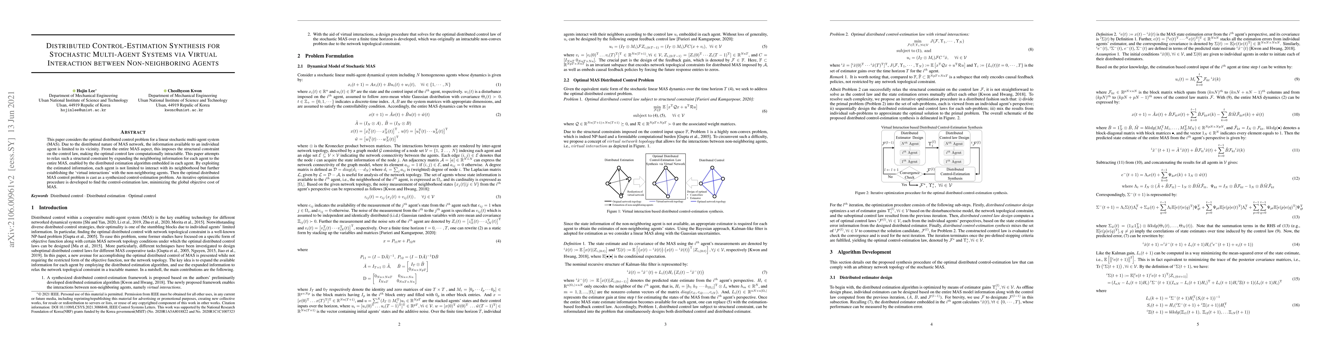 This paper considers the optimal distributed control problem for a linear stochastic multi-agent system (MAS). Due to the distributed nature of MAS network, the information available to an individual agent is limited to its vicinity. From the entire MAS aspect, this imposes the structural constraint on the control law, making the optimal control law computationally intractable. This paper attempts to relax such a structural constraint by expanding the neighboring information for each agent to the entire MAS, enabled by the distributed estimation algorithm embedded in each agent. By exploiting the estimated information, each agent is not limited to interact with its neighborhood but further establishing the `virtual interactions' with the non-neighboring agents. Then the optimal distributed MAS control problem is cast as a synthesized control-estimation problem. An iterative optimization procedure is developed to find the control-estimation law, minimizing the global objective cost of MAS.