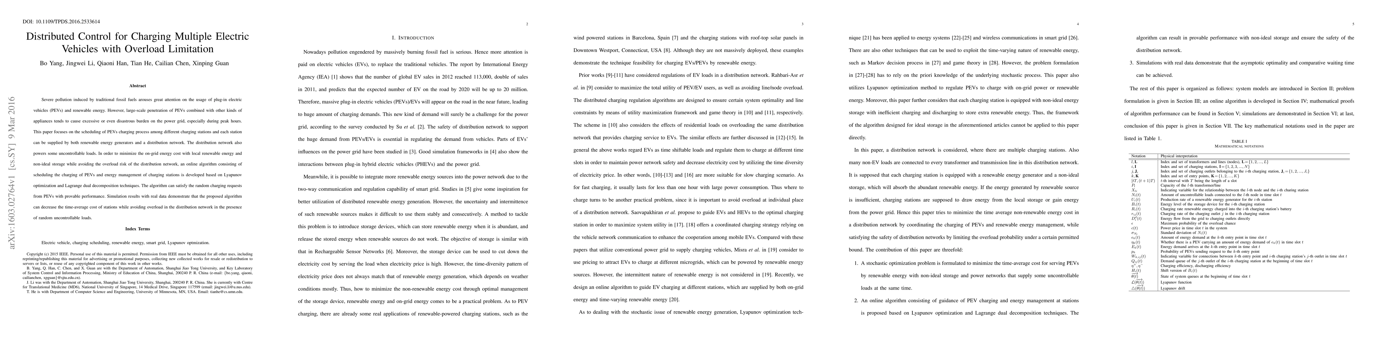 This paper proposes an online algorithm for scheduling the charging of multiple electric vehicles at different stations, utilizing both renewable energy and grid power, to minimize on-grid energy costs while preventing distribution network overload. The algorithm employs Lyapunov optimization and Lagrange dual decomposition to manage charging and energy distribution effectively.