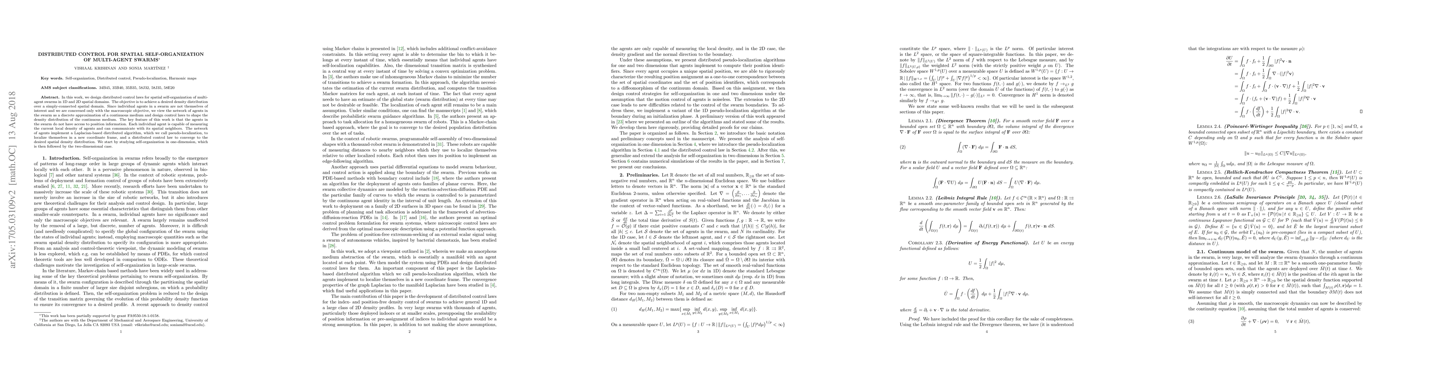 This research develops distributed control laws for multi-agent swarms to achieve desired spatial density distributions in 1D and 2D, leveraging local density measurements and neighbor communication without full position knowledge. The agents use a Laplacian-based pseudo-localization and distributed control to organize themselves.