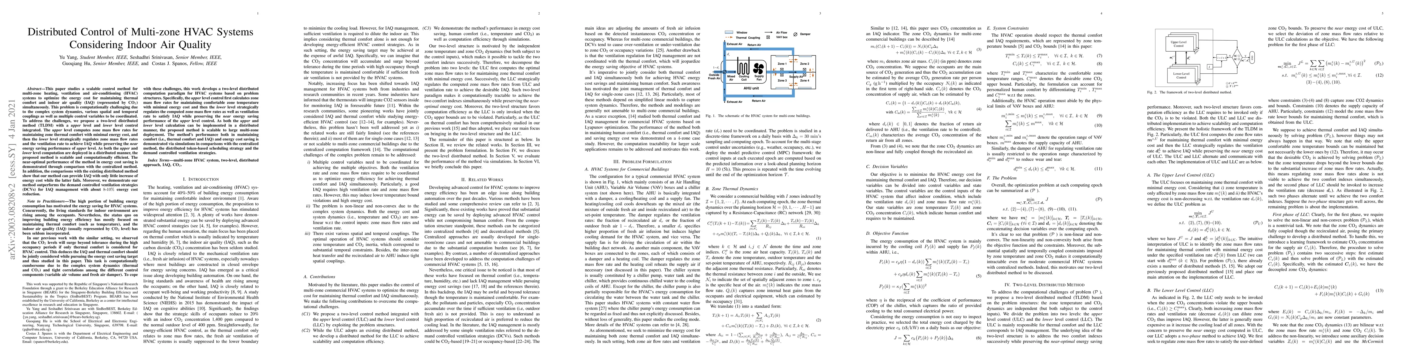 This paper studies a scalable control method for multi-zone heating, ventilation and air-conditioning (HVAC) systems to optimize the energy cost for maintaining thermal comfort and indoor air quality (IAQ) (represented by CO2) simultaneously. This problem is computationally challenging due to the complex system dynamics, various spatial and temporal couplings as well as multiple control variables to be coordinated. To address the challenges, we propose a two-level distributed method (TLDM) with a upper level and lower level control integrated. The upper level computes zone mass flow rates for maintaining zone thermal comfort with minimal energy cost, and then the lower level strategically regulates zone mass flow rates and the ventilation rate to achieve IAQ while preserving the near energy saving performance of upper level. As both the upper and lower level computation are deployed in a distributed manner, the proposed method is scalable and computationally efficient. The near-optimal performance of the method in energy cost saving is demonstrated through comparison with the centralized method. In addition, the comparisons with the existing distributed method show that our method can provide IAQ with only little increase of energy cost while the latter fails. Moreover, we demonstrate our method outperforms the demand controlled ventilation strategies (DCVs) for IAQ management with about 8-10% energy cost reduction.