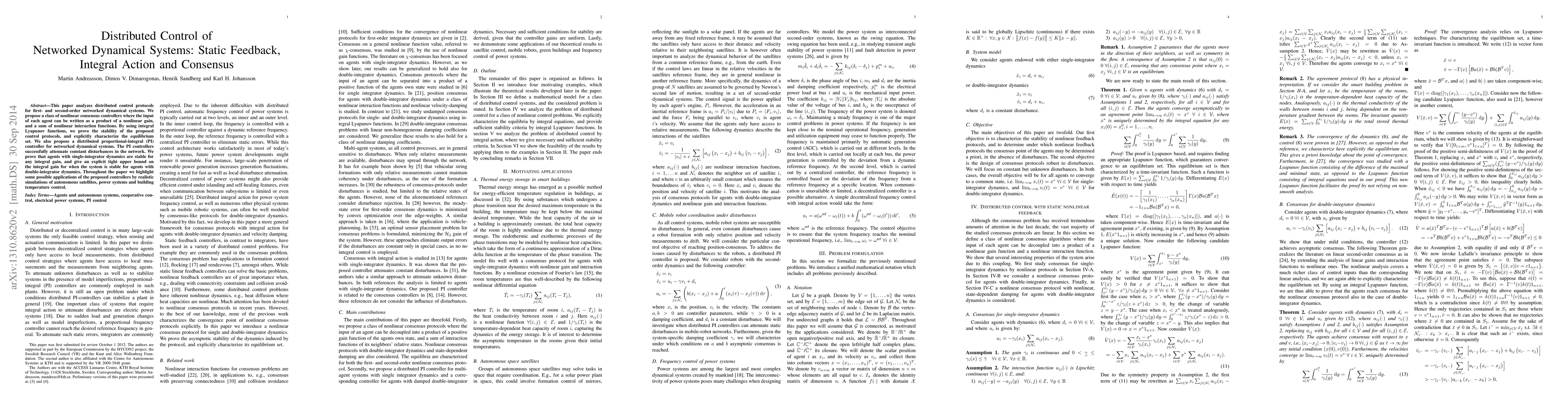 This paper proposes distributed control protocols for networked dynamical systems, including nonlinear consensus and proportional-integral controllers, and proves their stability using integral Lyapunov functions. It also provides explicit stability conditions for agents with single and double-integrator dynamics.