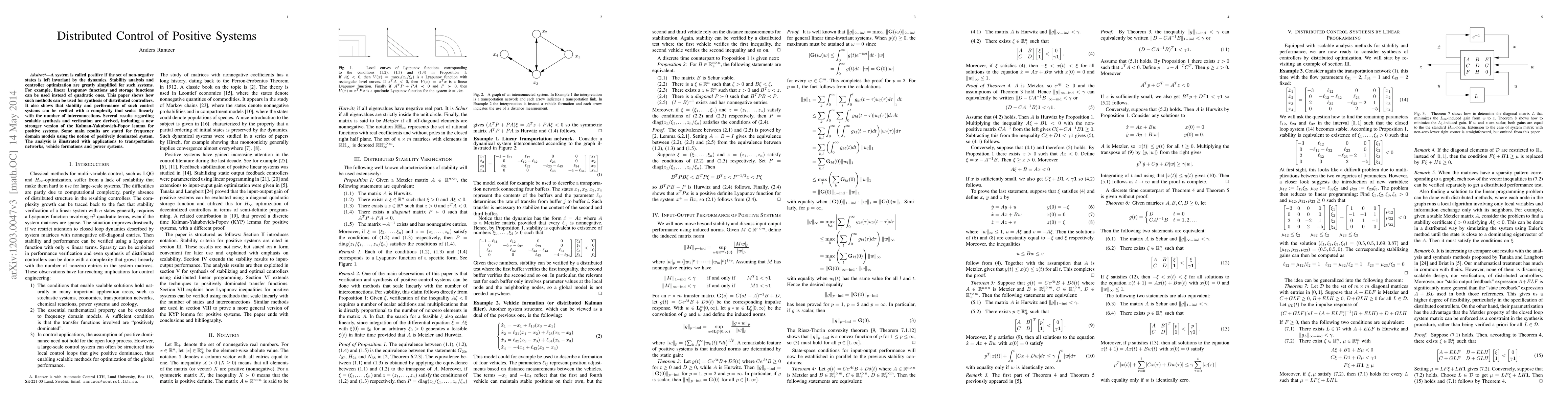 A system is called positive if the set of non-negative states is left invariant by the dynamics. Stability analysis and controller optimization are greatly simplified for such systems. For example, linear Lyapunov functions and storage functions can be used instead of quadratic ones. This paper shows how such methods can be used for synthesis of distributed controllers. It also shows that stability and performance of such control systems can be verified with a complexity that scales linearly with the number of interconnections. Several results regarding scalable synthesis and verfication are derived, including a new stronger version of the Kalman-Yakubovich-Popov lemma for positive systems. Some main results are stated for frequency domain models using the notion of positively dominated system. The analysis is illustrated with applications to transportation networks, vehicle formations and power systems.