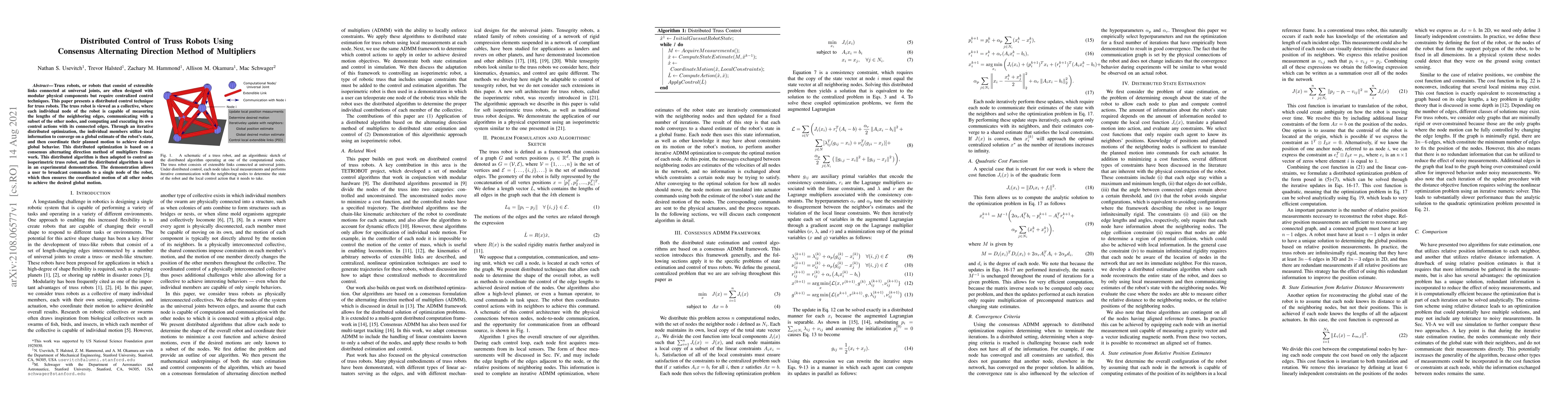 This paper proposes a distributed control technique for truss robots using a consensus alternating direction method of multipliers framework, enabling individual nodes to coordinate their actions based on local information to achieve desired global behavior. Experimental results demonstrate the effectiveness of the algorithm in enabling coordinated motion across the robot.