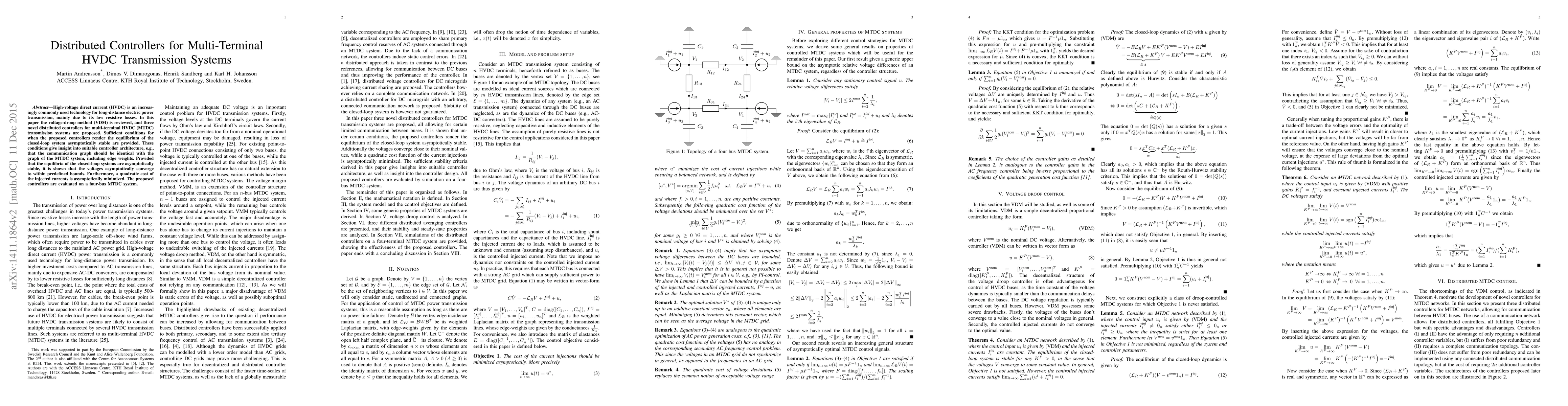 This paper proposes three novel distributed controllers for multi-terminal HVDC transmission systems using the voltage-droop method, ensuring asymptotic stability and voltage convergence within predefined bounds. The controllers minimize injected current cost and are evaluated on a four-bus system.