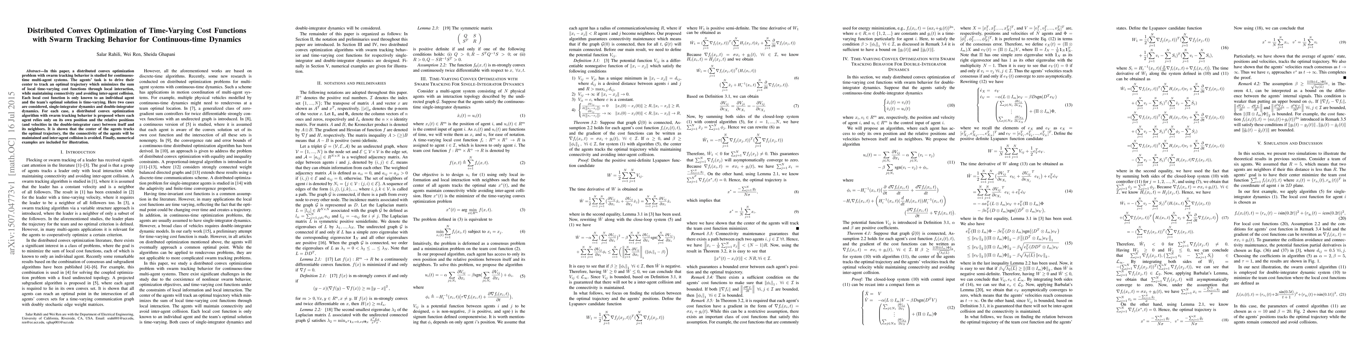This paper proposes a distributed convex optimization algorithm for continuous-time multi-agent systems to track an optimal trajectory that minimizes time-varying local cost functions, while maintaining connectivity and avoiding collisions. Algorithms are developed for both single-integrator and double-integrator dynamics, ensuring swarm tracking behavior through local interactions.