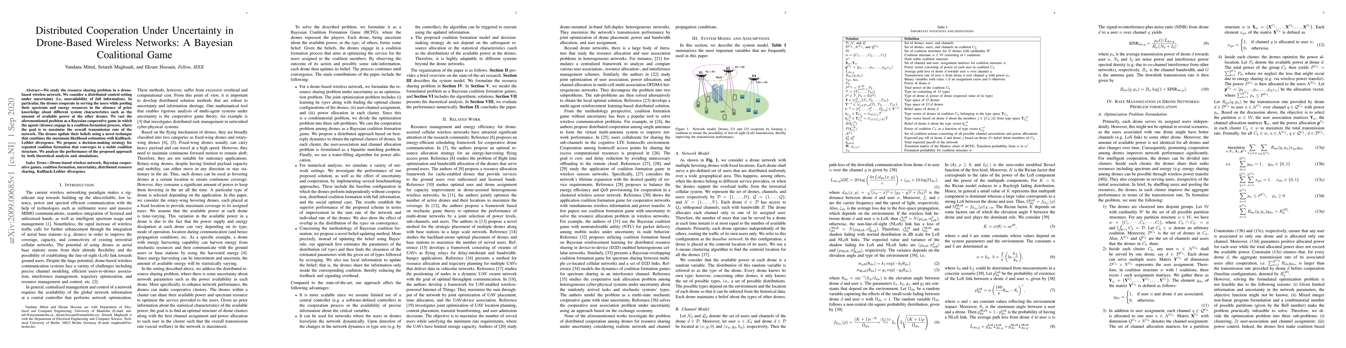 Researchers develop a method for drones to cooperate under uncertainty in a wireless network, using Bayesian games to maximize transmission rates. Their approach combines maximum likelihood estimation with Kullback-Leibler divergence to achieve stable coalition structures.