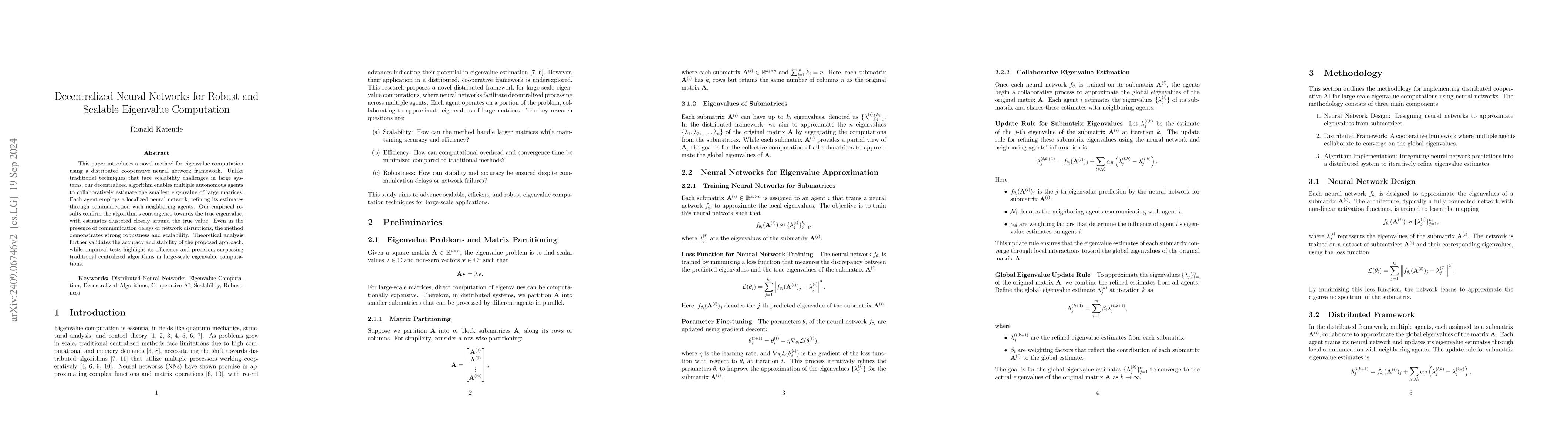 This paper presents a novel method for eigenvalue computation using a distributed cooperative neural network framework. Unlike traditional techniques that struggle with scalability in large systems, our decentralized algorithm enables multiple autonomous agents to collaboratively estimate the smallest eigenvalue of large matrices. Each agent uses a localized neural network model, refining its estimates through inter-agent communication. Our approach guarantees convergence to the true eigenvalue, even with communication failures or network disruptions. Theoretical analysis confirms the robustness and accuracy of the method, while empirical results demonstrate its better performance compared to some traditional centralized algorithms