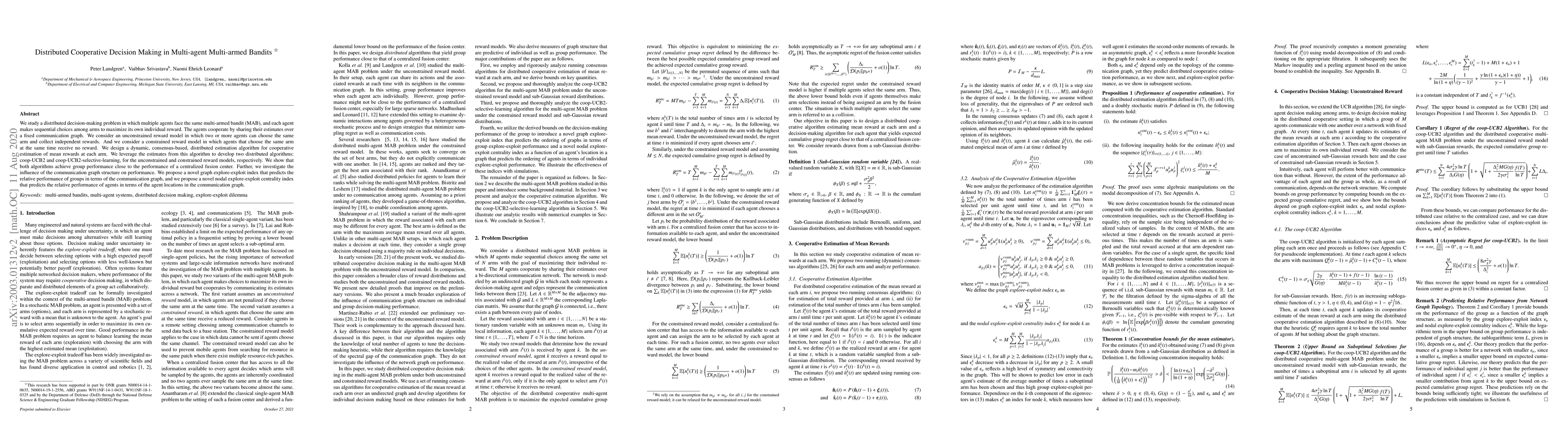 This paper explores distributed cooperative decision-making in multi-agent multi-armed bandit problems, proposing dynamic consensus-based algorithms for both unconstrained and constrained reward models. It introduces indices to predict performance based on communication graph structures.
