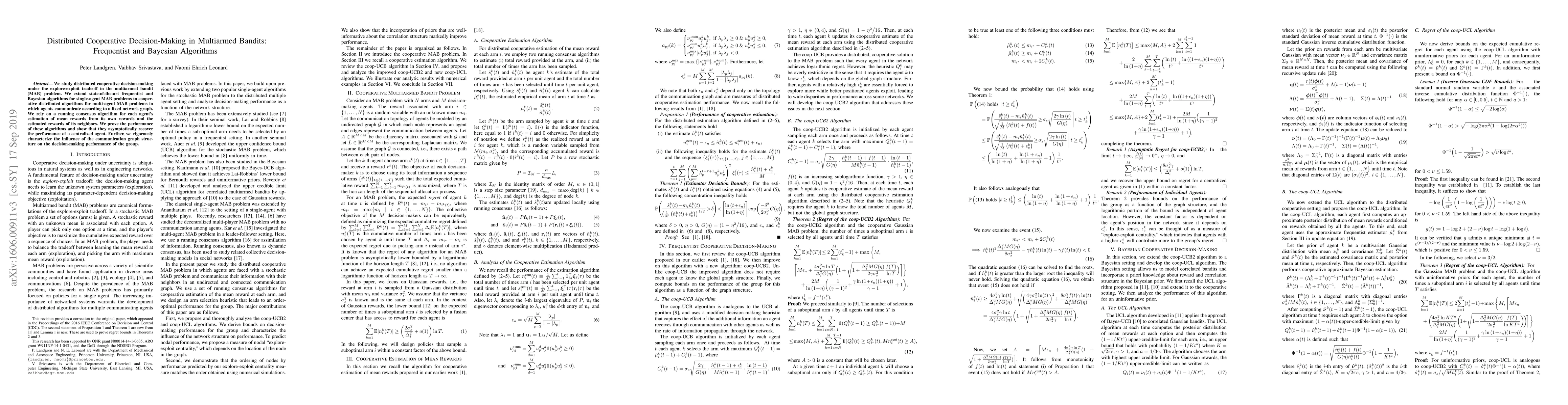 This paper extends single-agent multiarmed bandit algorithms to cooperative distributed versions for multi-agent scenarios, incorporating a consensus mechanism for shared reward estimation. It demonstrates that these algorithms achieve near-optimal performance compared to a centralized agent, while also analyzing the impact of network graph structure on group performance.