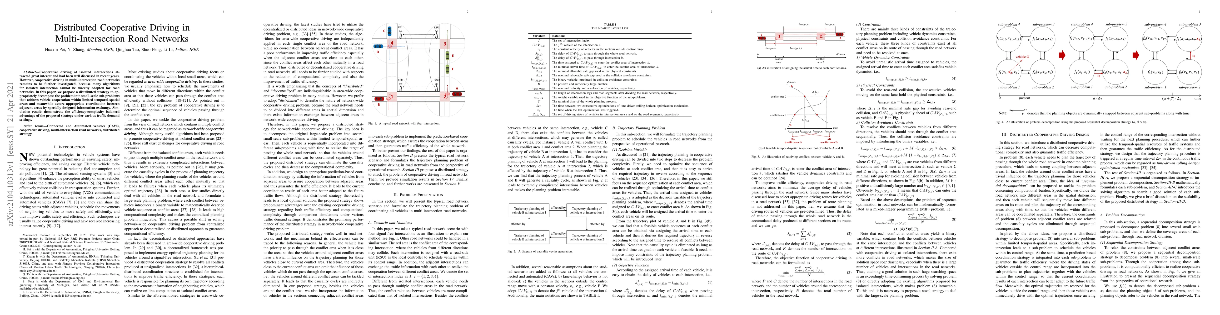 This paper proposes a distributed cooperative driving strategy for multi-intersection road networks, decomposing the problem into manageable sub-problems with coordinated information exchange between adjacent areas. Simulation results show the proposed method's efficiency-complexity balance under different traffic conditions.