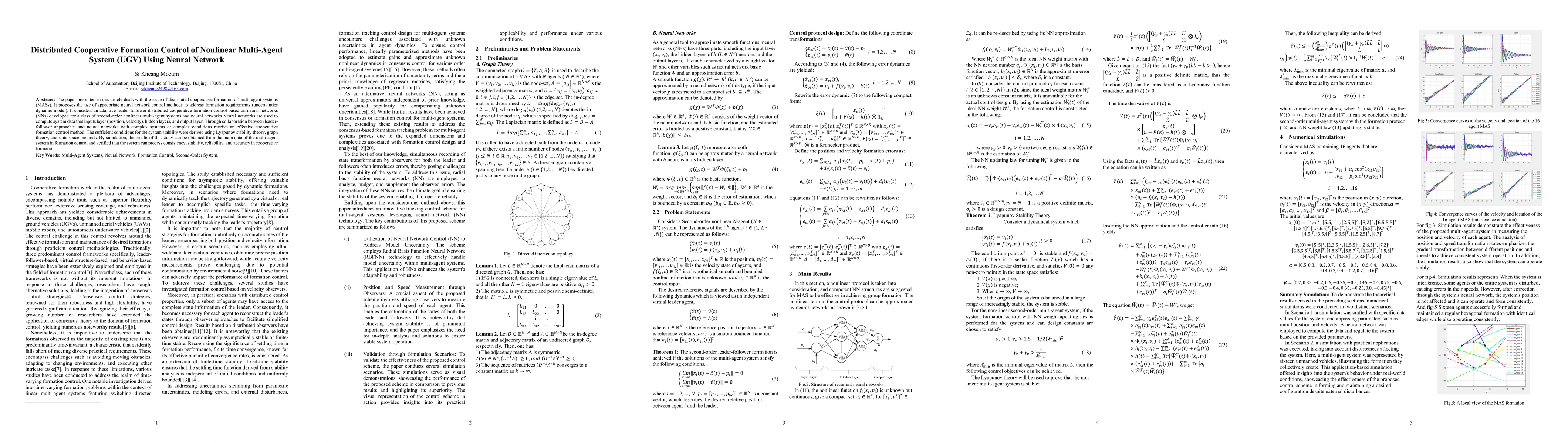 The paper presented in this article deals with the issue of distributed cooperative formation of multi-agent systems (MASs). It proposes the use of appropriate neural network control methods to address formation requirements (uncertainties dynamic model). It considers an adaptive leader-follower distributed cooperative formation control based on neural networks (NNs) developed for a class of second-order nonlinear multi-agent systems and neural networks Neural networks are used to compute system data that inputs layer (position, velocity), hidden layers, and output layer. Through collaboration between leader-follower approaches and neural networks with complex systems or complex conditions receive an effective cooperative formation control method. The sufficient conditions for the system stability were derived using Lyapunov stability theory, graph theory, and state space methods. By simulation, the results of this study can be obtained from the main data of the multi-agent system in formation control and verified that the system can process consistency, stability, reliability, and accuracy in cooperative formation.