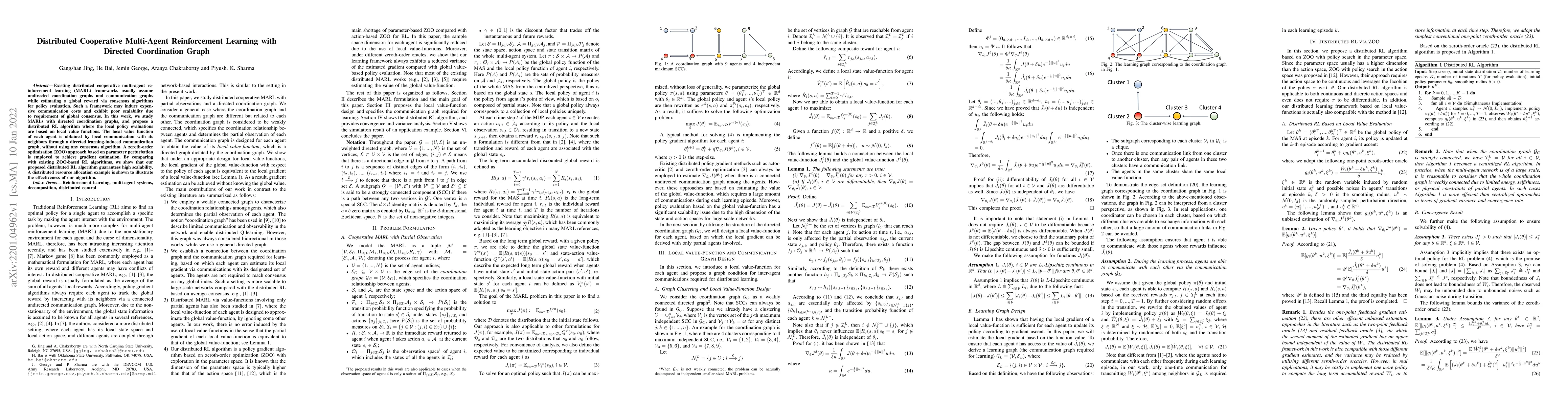 This paper proposes a distributed cooperative multi-agent reinforcement learning framework using directed coordination graphs, eliminating global consensus for improved scalability. It employs a zeroth-order optimization approach for local policy evaluation via directed communication, demonstrating effectiveness through a resource allocation example.