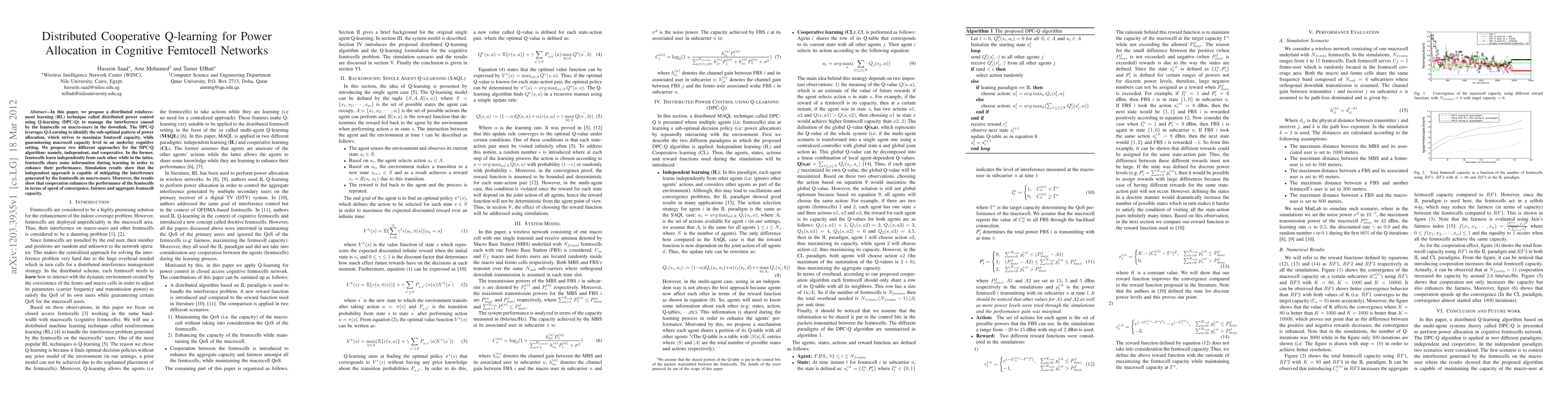 This paper proposes a distributed cooperative Q-learning technique, DPC-Q, for managing interference in cognitive femtocell networks. The independent approach mitigates interference, while the cooperative approach enhances performance through information sharing, improving convergence, fairness, and aggregate capacity.