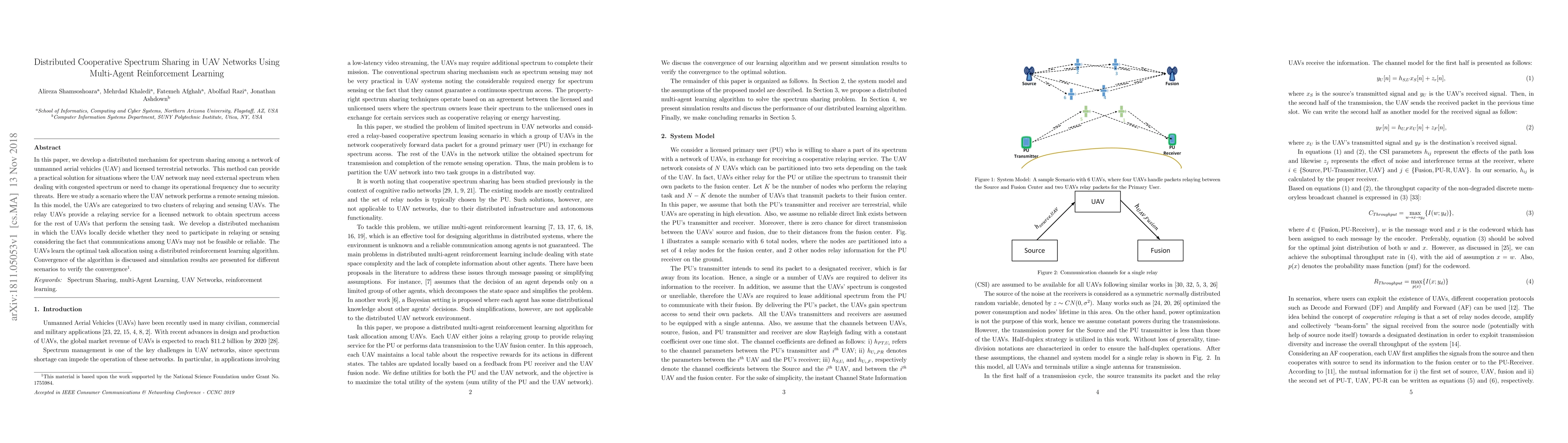 This paper proposes a distributed cooperative spectrum sharing mechanism for UAV networks using multi-agent reinforcement learning, enabling UAVs to decide between relaying or sensing tasks based on local conditions. Simulation results demonstrate the algorithm's convergence in various scenarios.