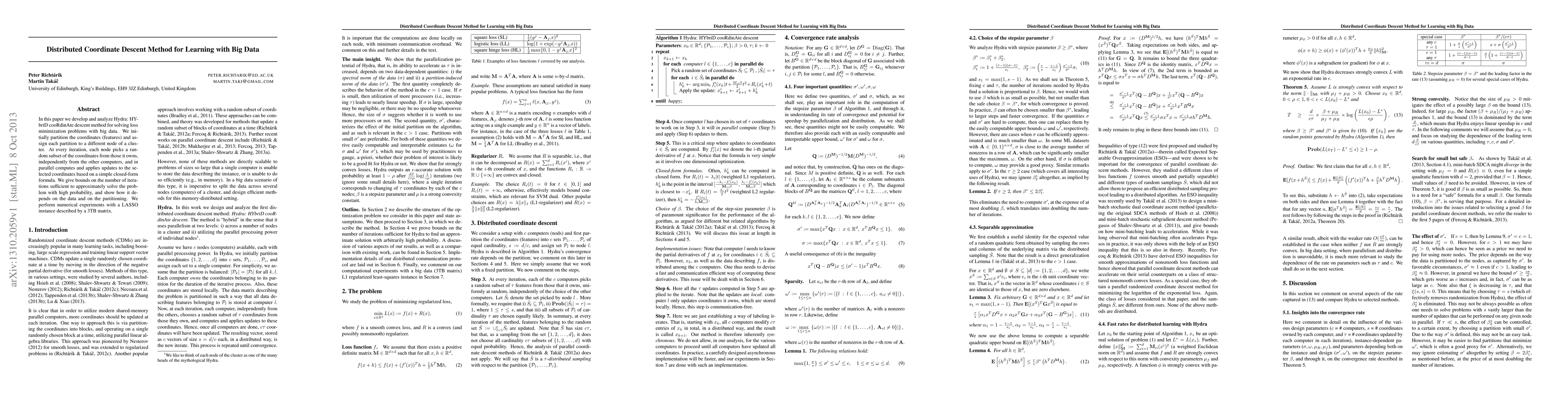 This paper introduces Hydra, a distributed coordinate descent method for big data loss minimization problems. It partitions coordinates across cluster nodes, allowing parallel updates via random subsets, with iteration bounds dependent on data and partitioning. Numerical experiments with a 3TB LASSO instance demonstrate its effectiveness.