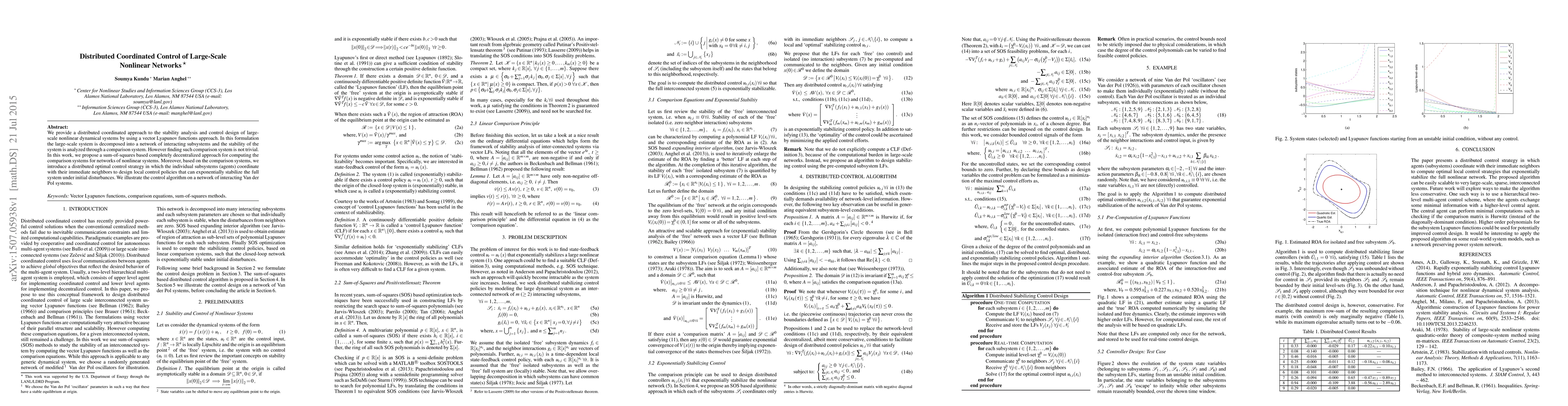 This paper proposes a distributed coordinated control strategy for large-scale nonlinear networks using vector Lyapunov functions and a sum-of-squares based decentralized approach to compute comparison systems. The method enables local control policies that exponentially stabilize the network under initial disturbances.