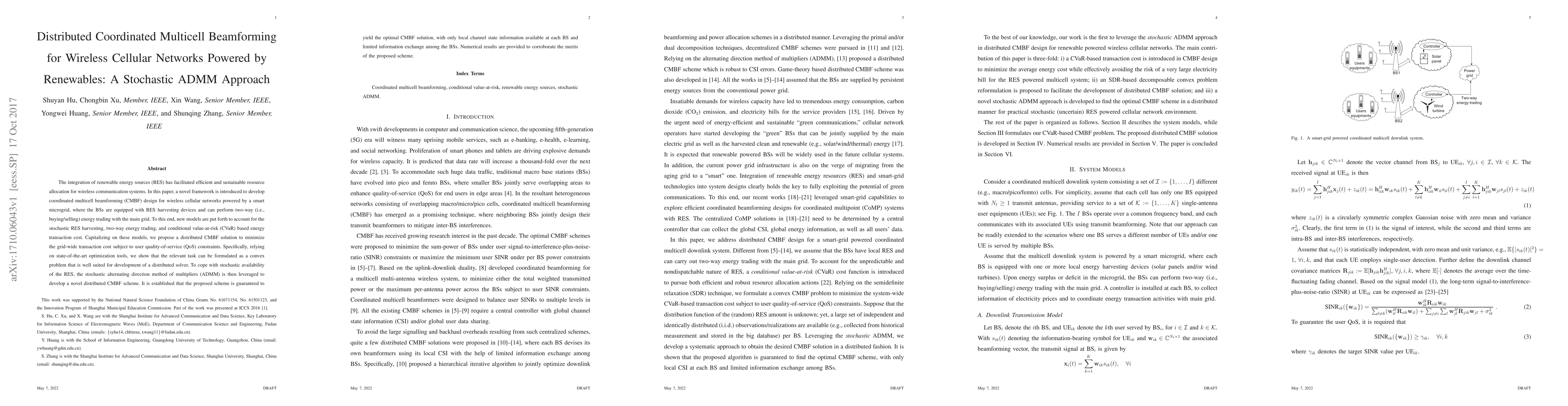 The integration of renewable energy sources (RES) has facilitated efficient and sustainable resource allocation for wireless communication systems. In this paper, a novel framework is introduced to develop coordinated multicell beamforming (CMBF) design for wireless cellular networks powered by a smart microgrid, where the BSs are equipped with RES harvesting devices and can perform two-way (i.e., buying/selling) energy trading with the main grid. To this end, new models are put forth to account for the stochastic RES harvesting, two-way energy trading, and conditional value-at-risk (CVaR) based energy transaction cost. Capitalizing on these models, we propose a distributed CMBF solution to minimize the grid-wide transaction cost subject to user quality-of-service (QoS) constraints. Specifically, relying on state-of-the-art optimization tools, we show that the relevant task can be formulated as a convex problem that is well suited for development of a distributed solver. To cope with stochastic availability of the RES, the stochastic alternating direction method of multipliers (ADMM) is then leveraged to develop a novel distributed CMBF scheme. It is established that the proposed scheme is guaranteed to yield the optimal CMBF solution, with only local channel state information available at each BS and limited information exchange among the BSs. Numerical results are provided to corroborate the merits of the proposed scheme.