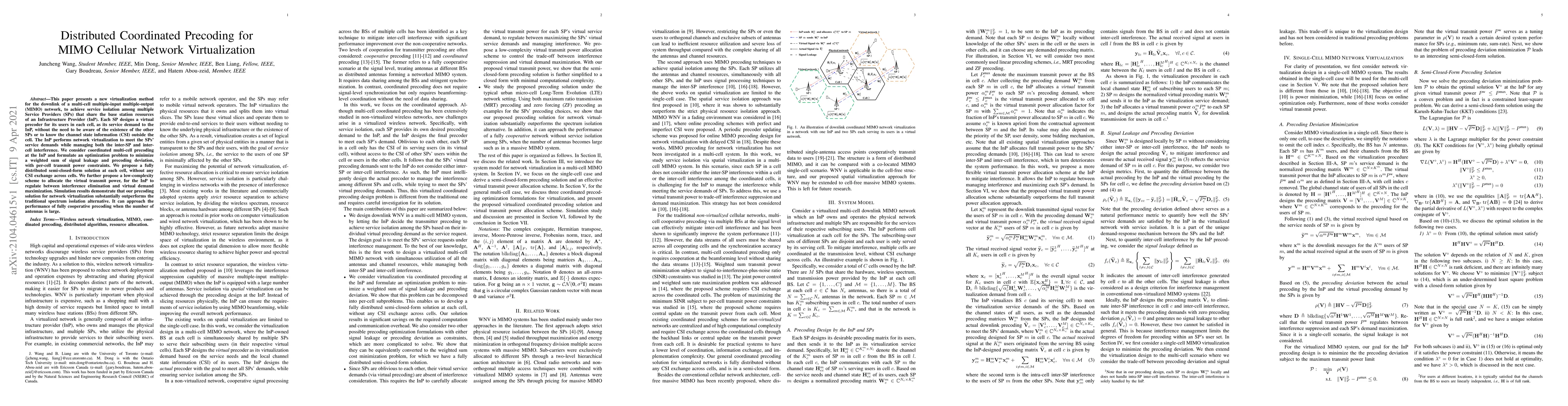 This paper introduces a new virtualization method for multi-cell MIMO networks, enabling service isolation among multiple Service Providers sharing base station resources. It proposes a distributed precoding solution that optimizes signal leakage and precoding deviation, achieving superior performance compared to traditional spectrum isolation methods.