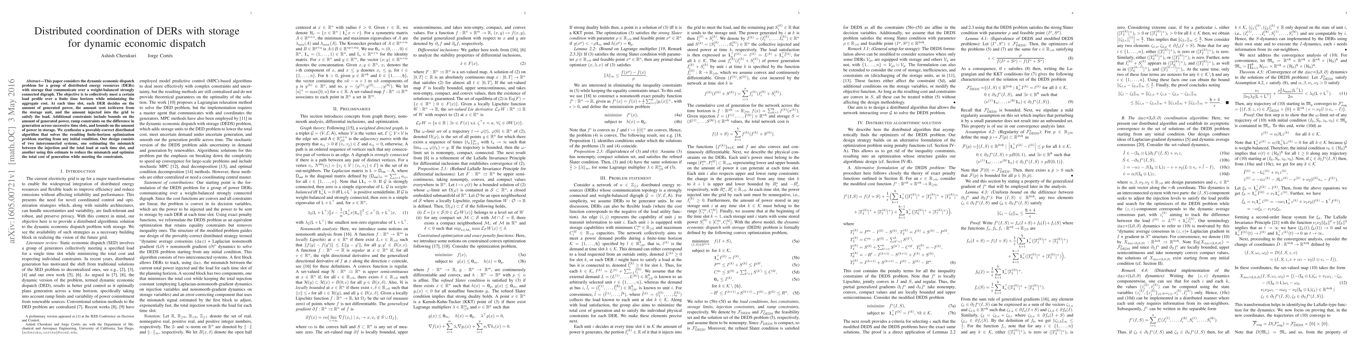 This paper presents a distributed algorithm for dynamic economic dispatch of distributed energy resources (DERs) with storage, aiming to meet load profiles while minimizing costs. The algorithm estimates and corrects mismatches between generation and load, optimizing power generation and storage usage under various constraints.