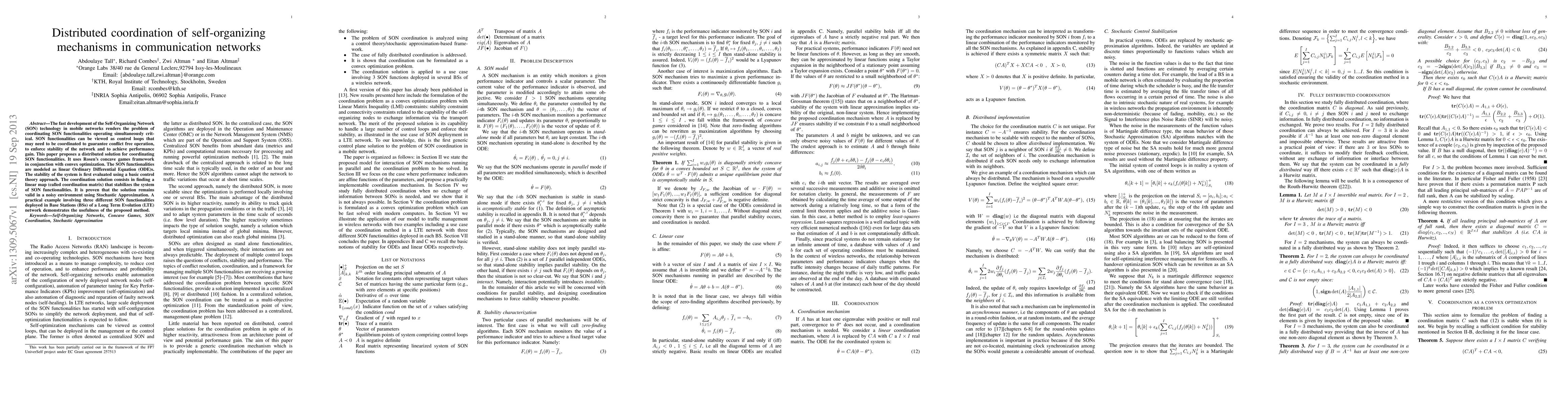This paper proposes a distributed coordination method for Self-Organizing Network (SON) functionalities using Rosen's concave games and convex optimization. It models SON functionalities as linear ODEs, stabilizes the system with a coordination matrix, and demonstrates its effectiveness in an LTE network environment.