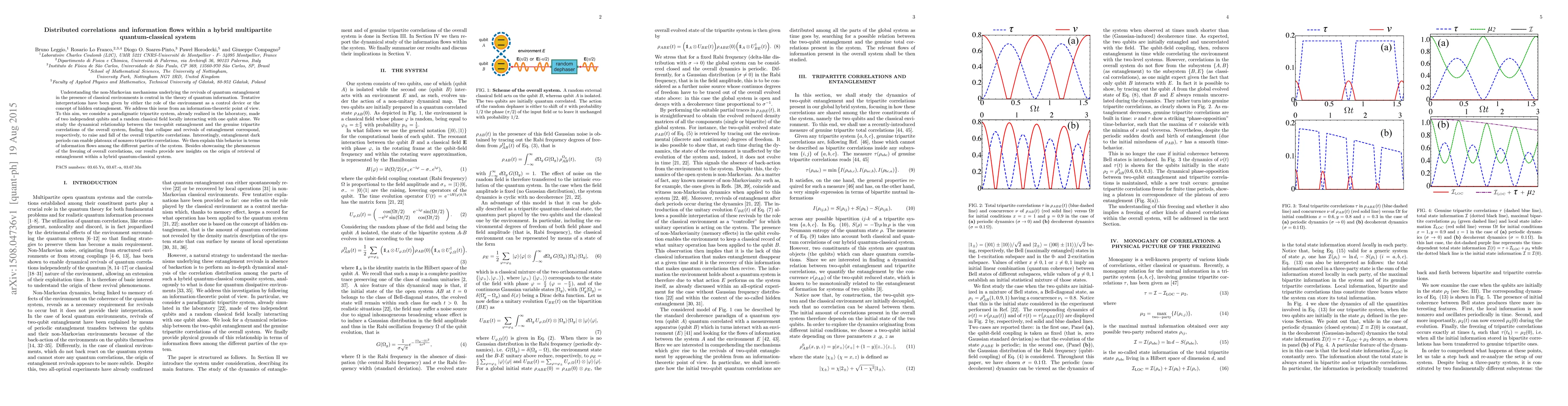 Understanding the non-Markovian mechanisms underlying the revivals of quantum entanglement in the presence of classical environments is central in the theory of quantum information. Tentative interpretations have been given by either the role of the environment as a control device or the concept of hidden entanglement. We address this issue from an information-theoretic point of view. To this aim, we consider a paradigmatic tripartite system, already realized in the laboratory, made of two independent qubits and a random classical field locally interacting with one qubit alone. We study the dynamical relationship between the two-qubit entanglement and the genuine tripartite correlations of the overall system, finding that collapse and revivals of entanglement correspond, respectively, to raise and fall of the overall tripartite correlations. Interestingly, entanglement dark periods can enable plateaux of nonzero tripartite correlations. We then explain this behavior in terms of information flows among the different parties of the system. Besides showcasing the phenomenon of the freezing of overall correlations, our results provide new insights on the origin of retrieval of entanglement within a hybrid quantum-classical system.