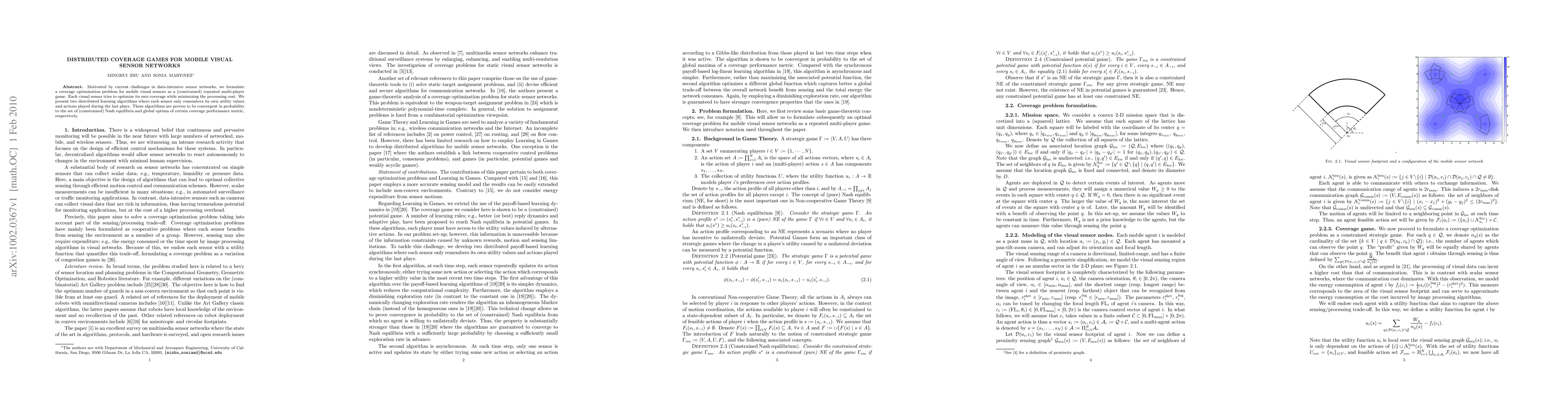 This paper formulates a coverage optimization problem for mobile visual sensors as a repeated multi-player game, proposing two distributed learning algorithms that converge to Nash equilibria and global optima while minimizing processing costs. The algorithms ensure each sensor only retains limited utility and action data.