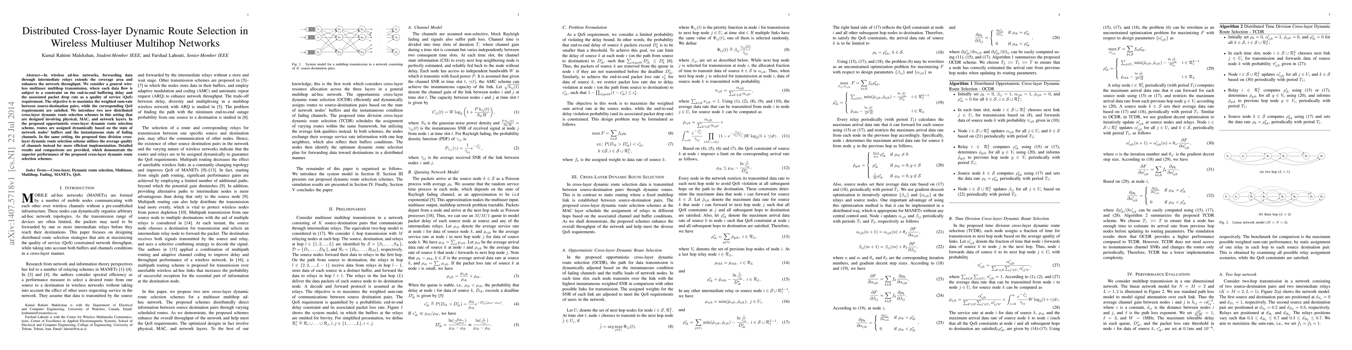 The paper proposes two distributed cross-layer dynamic route selection schemes for wireless multiuser multihop networks, involving physical, MAC, and network layers. These schemes aim to maximize the weighted sum-rate between source-destination pairs while satisfying QoS requirements on end-to-end delay and packet drop rate.