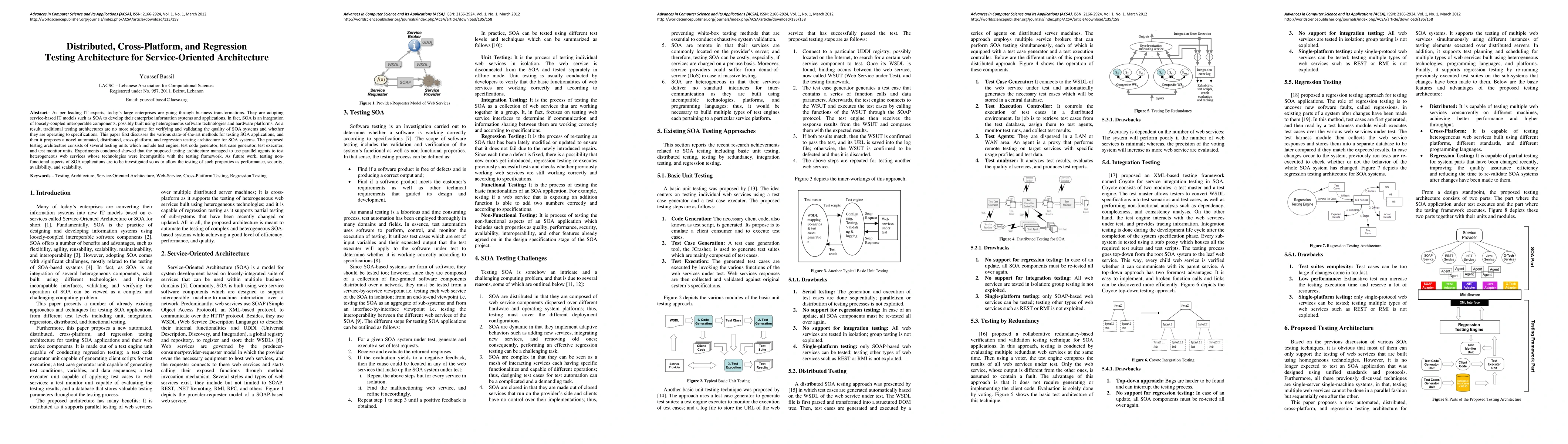 This paper proposes a novel distributed, cross-platform, and regression testing architecture for service-oriented architecture (SOA) systems, addressing the inadequacy of traditional testing methods for SOA's heterogeneous components. The architecture includes various testing units and demonstrated successful parallel testing of incompatible web services.