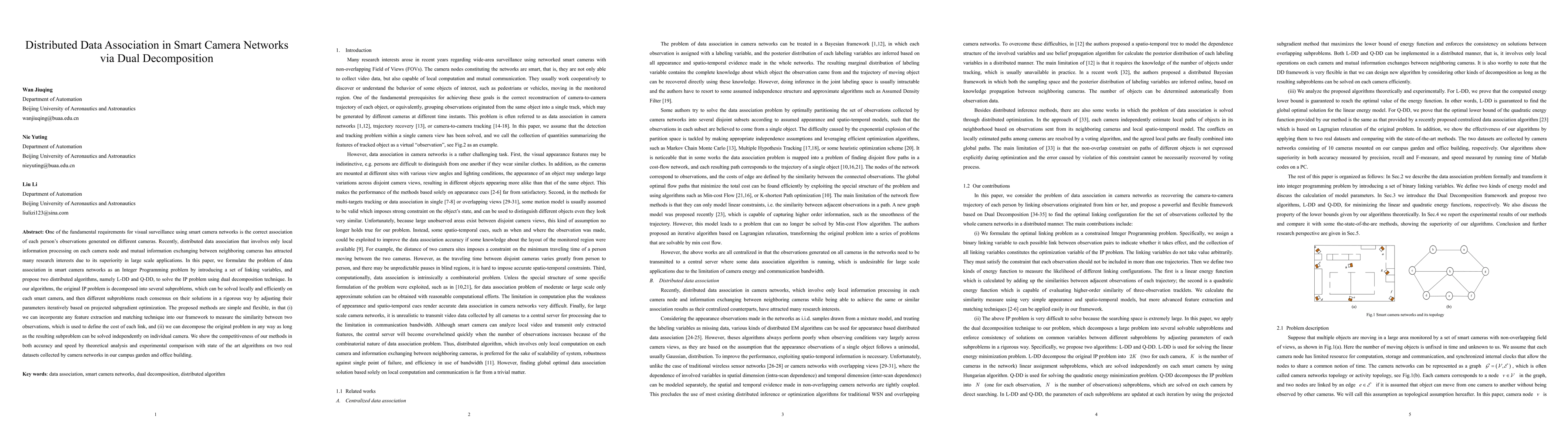 This paper proposes two distributed algorithms, L-DD and Q-DD, for data association in smart camera networks using dual decomposition. The algorithms decompose the Integer Programming problem into local sub-problems, solved efficiently on individual cameras, and achieve consensus through projected sub-gradient optimization, demonstrating competitive accuracy and speed in experiments.