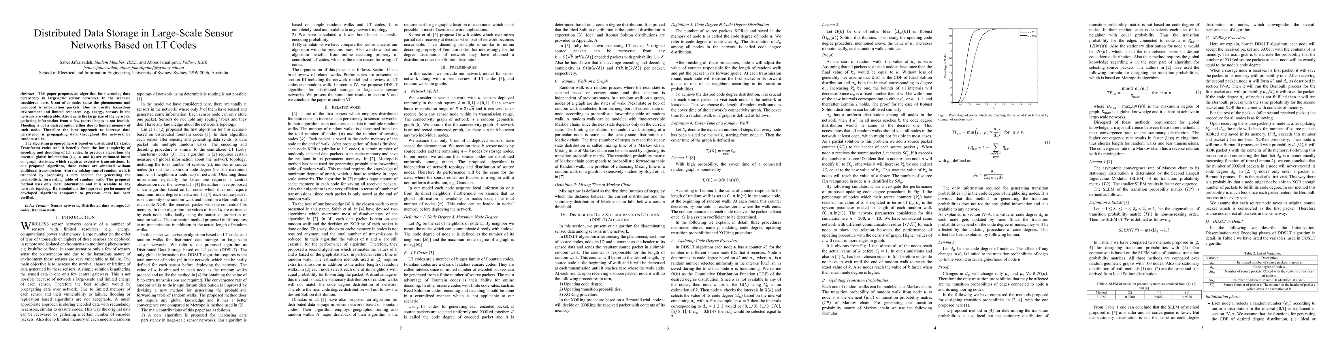 This paper introduces an algorithm based on distributed LT codes to enhance data persistency in large-scale sensor networks, utilizing random walks for data propagation without excessive transmissions. The proposed method improves scalability and performance by leveraging local information and optimizing the probabilistic forwarding table.
