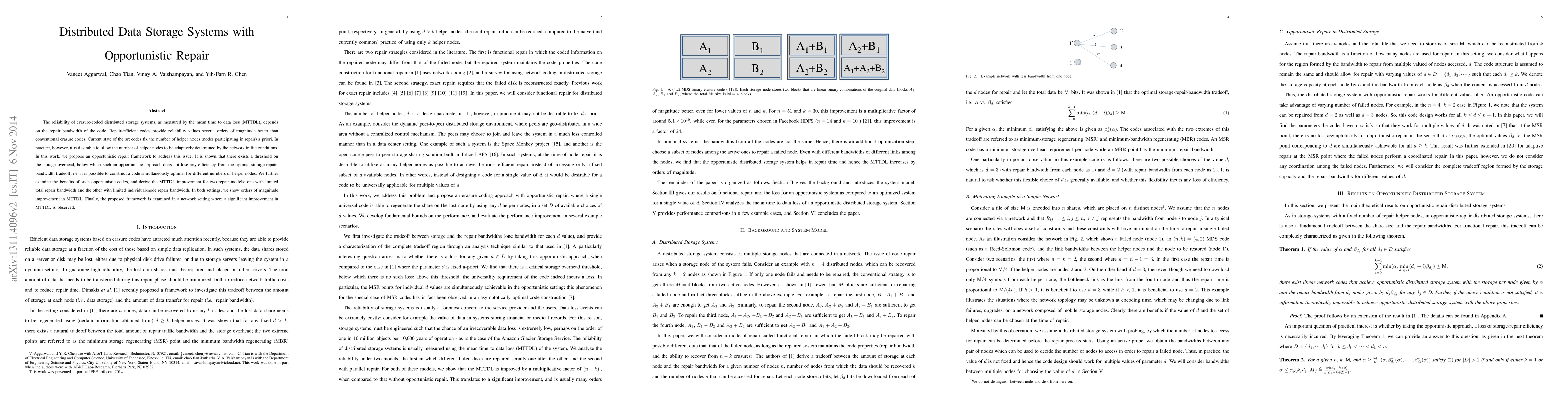 This paper proposes an opportunistic repair framework for distributed data storage systems to adaptively determine the number of helper nodes based on network conditions, achieving significant improvements in mean time to data loss (MTTDL) compared to conventional codes. The framework maintains optimal storage-repair-bandwidth tradeoff without efficiency loss below a certain storage overhead threshold.