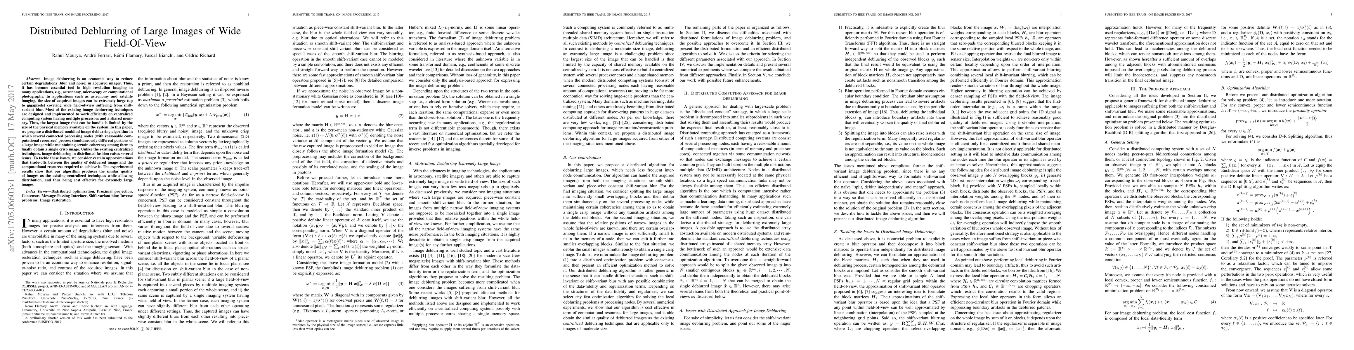 This paper presents a distributed algorithm for deblurring large, wide-field-of-view images, overcoming memory limitations of centralized systems. The method, suitable for applications like astronomy, trades off some image quality for significant computational resource savings, achieving results comparable to centralized techniques.