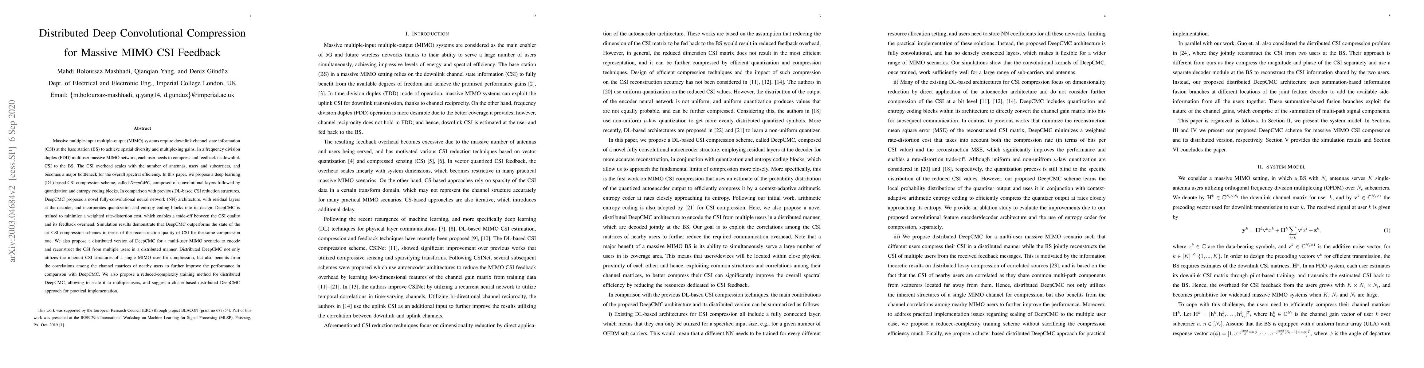 This paper proposes DeepCMC, a deep learning-based scheme for compressing channel state information (CSI) in massive MIMO systems, which uses convolutional layers and quantization for efficient feedback. A distributed version leverages user correlations to enhance performance, with a reduced-complexity training method and cluster-based approach for practical implementation.