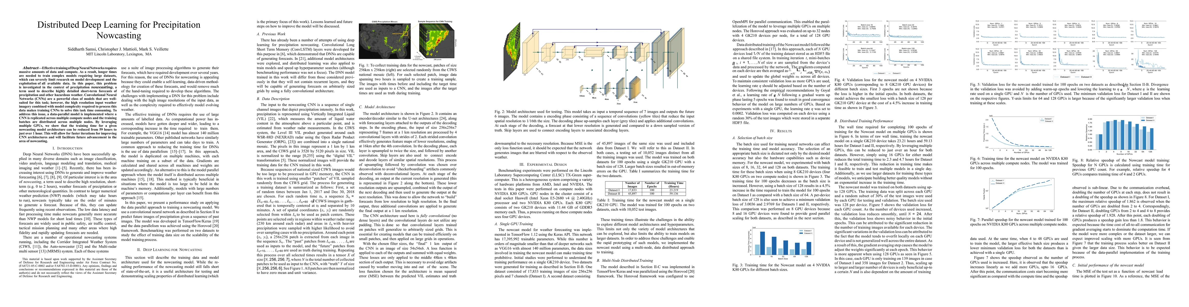 This research explores the use of distributed deep learning to expedite the training of Convolutional Neural Networks (CNNs) for precipitation nowcasting. By implementing a data-parallel model across multiple compute nodes, the training time for these complex models is significantly reduced, enabling faster iterations and advancements in nowcasting technology.