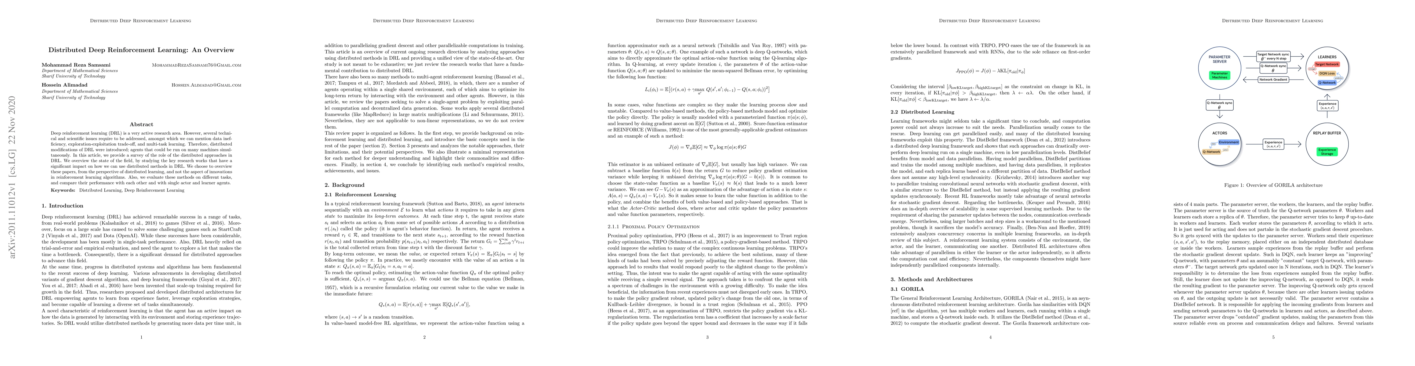 This paper surveys distributed deep reinforcement learning (DRL) approaches, focusing on how distributed methods address technical challenges like data inefficiency and the exploration-exploitation trade-off. It evaluates key research works and compares their performance against single-agent DRL methods.
