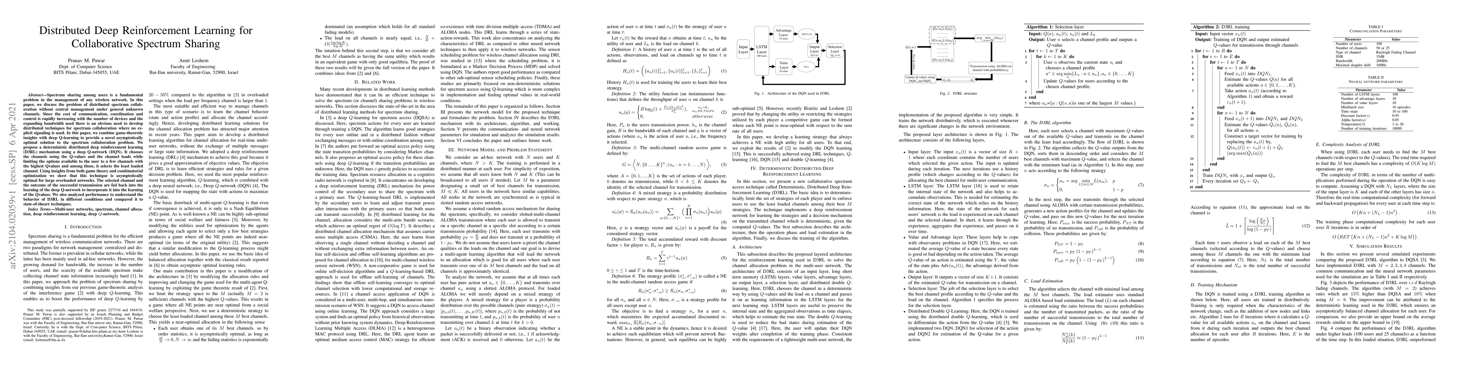 Spectrum sharing among users is a fundamental problem in the management of any wireless network. In this paper, we discuss the problem of distributed spectrum collaboration without central management under general unknown channels. Since the cost of communication, coordination and control is rapidly increasing with the number of devices and the expanding bandwidth used there is an obvious need to develop distributed techniques for spectrum collaboration where no explicit signaling is used. In this paper, we combine game-theoretic insights with deep Q-learning to provide a novel asymptotically optimal solution to the spectrum collaboration problem. We propose a deterministic distributed deep reinforcement learning(D3RL) mechanism using a deep Q-network (DQN). It chooses the channels using the Q-values and the channel loads while limiting the options available to the user to a few channels with the highest Q-values and among those, it selects the least loaded channel. Using insights from both game theory and combinatorial optimization we show that this technique is asymptotically optimal for large overloaded networks. The selected channel and the outcome of the successful transmission are fed back into the learning of the deep Q-network to incorporate it into the learning of the Q-values. We also analyzed performance to understand the behavior of D3RL in differ