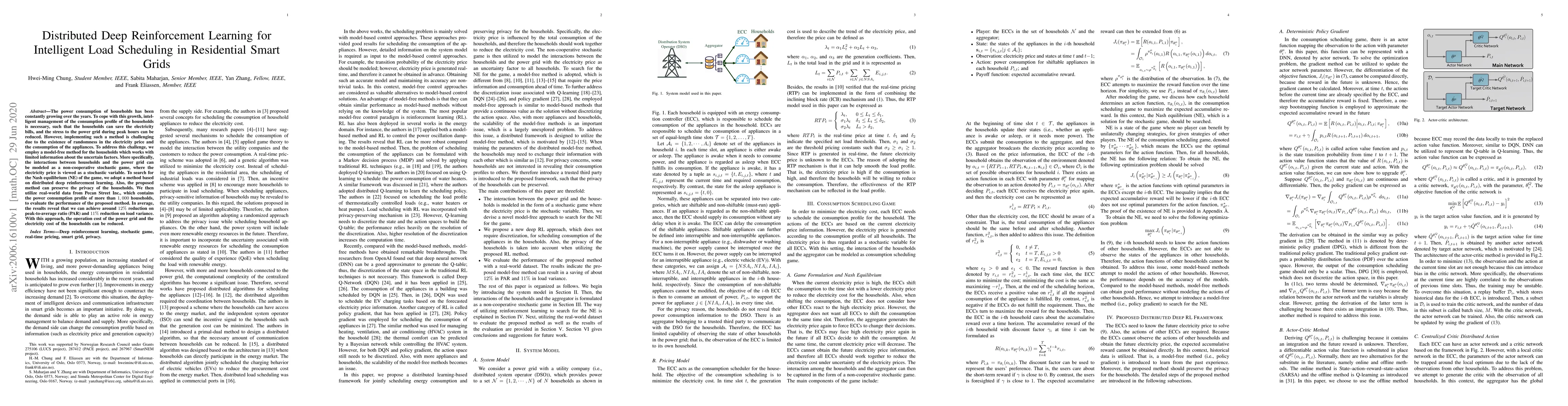 This paper proposes a distributed deep reinforcement learning method for intelligent load scheduling in residential smart grids to manage household power consumption, reduce peak load stress, and lower electricity costs. The method achieves a 12% reduction in peak-to-average ratio and 11% in load variance using real-world data, while preserving household privacy.
