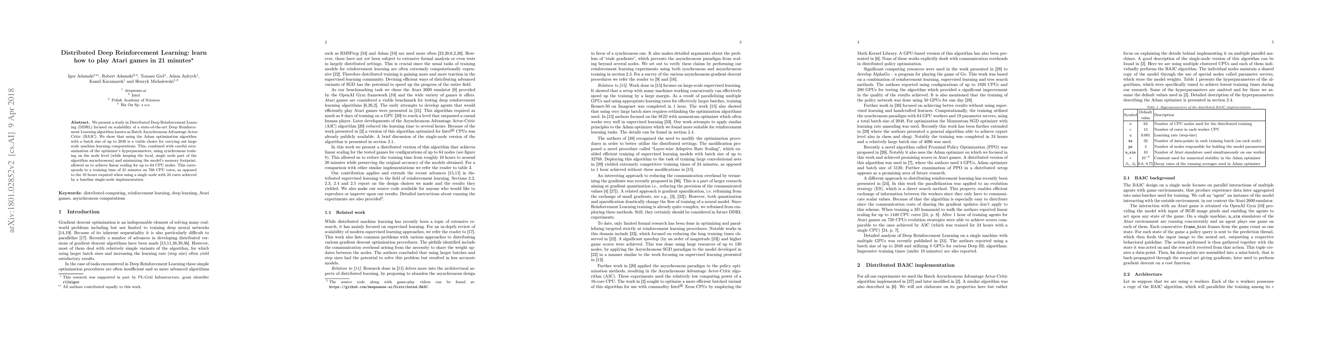This study demonstrates the scalability of the Batch Asynchronous Advantage ActorCritic (BA3C) algorithm in Distributed Deep Reinforcement Learning, achieving Atari game mastery in 21 minutes using 768 CPU cores, compared to 10 hours on a single node with 24 cores. Optimization techniques include Adam optimization, batch size adjustments, and memory footprint minimization.