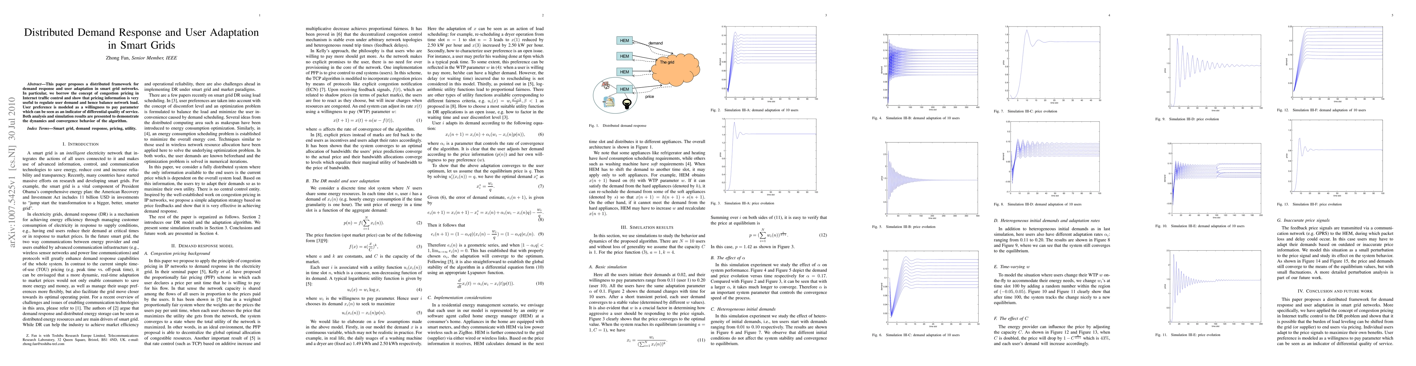 This paper introduces a distributed demand response framework for smart grids, leveraging congestion pricing to balance network load. It models user preference through a willingness to pay parameter, demonstrating algorithm dynamics and convergence via analysis and simulations.