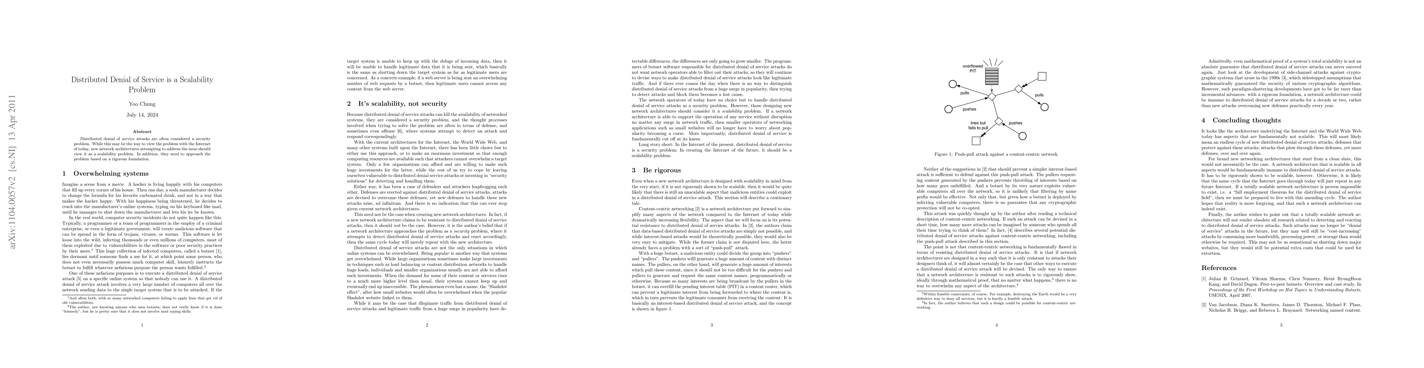 Summary: This paper argues that distributed denial of service (DDoS) attacks should be viewed as a scalability issue rather than solely a security problem, especially in emerging network architectures, and emphasizes the need for a rigorous foundation to address this challenge.