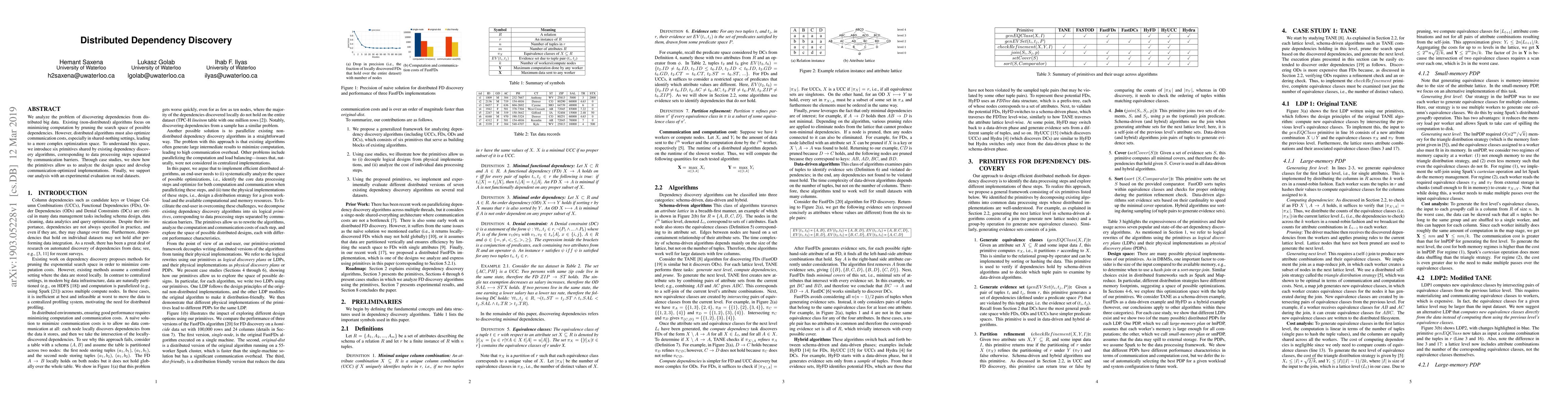 We analyze the problem of discovering dependencies from distributed big data. Existing (non-distributed) algorithms focus on minimizing computation by pruning the search space of possible dependencies. However, distributed algorithms must also optimize communication costs, especially in shared-nothing settings, leading to a more complex optimization space. To understand this space, we introduce six primitives shared by existing dependency discovery algorithms, corresponding to data processing steps separated by communication barriers. Through case studies, we show how the primitives allow us to analyze the design space and develop communication-optimized implementations. Finally, we support our analysis with an experimental evaluation on real datasets.