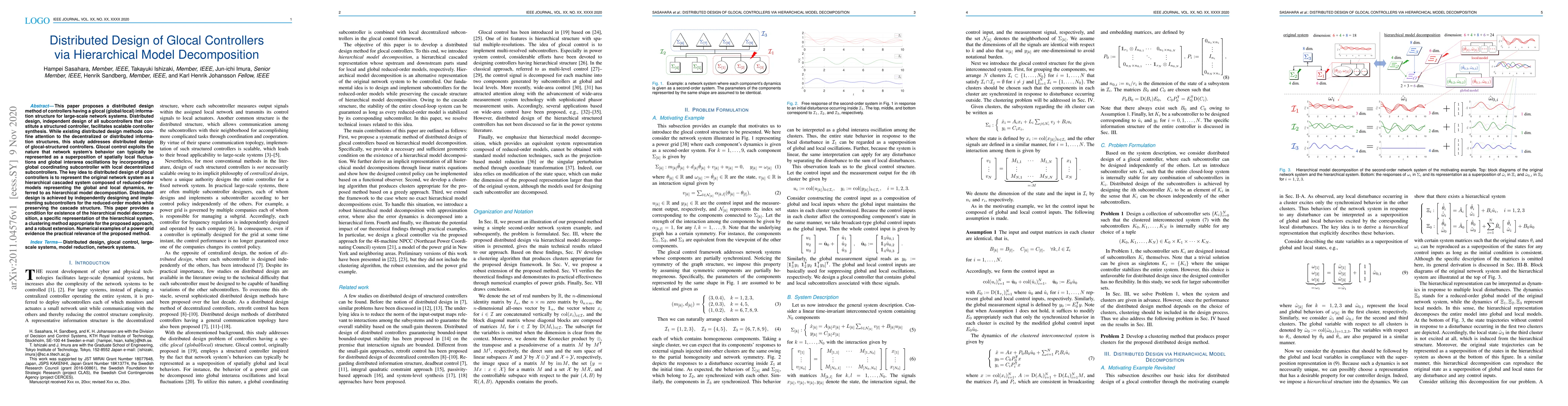 This paper proposes a distributed design method of controllers having a glocal (global/local) information structure for large-scale network systems. Distributed design, independent design of all subcontrollers that constitute a structured controller, facilitates scalable controller synthesis. While existing distributed design methods confine attention to the decentralized or distributed information structures, this study addresses distributed design of glocal-structured controllers. Glocal control exploits the nature that network system's behavior can typically be represented as a superposition of spatially local fluctuations and global interarea oscillations by incorporating a global coordinating subcontroller with local decentralized subcontrollers. The key idea to distributed design of glocal controllers is to represent the original network system as a hierarchical cascaded system composed of reduced-order models representing the global and local dynamics, referred to as hierarchical model decomposition. Distributed design is achieved by independently designing and implementing subcontrollers for the reduced-order models while preserving the cascade structure. This paper provides a condition for existence of the hierarchical model decomposition, a specific representation of the hierarchical system, a clustering method appropriate for the proposed approach, and a robust extension. Numerical examples of a power grid evidence the practical relevance of the proposed method.
