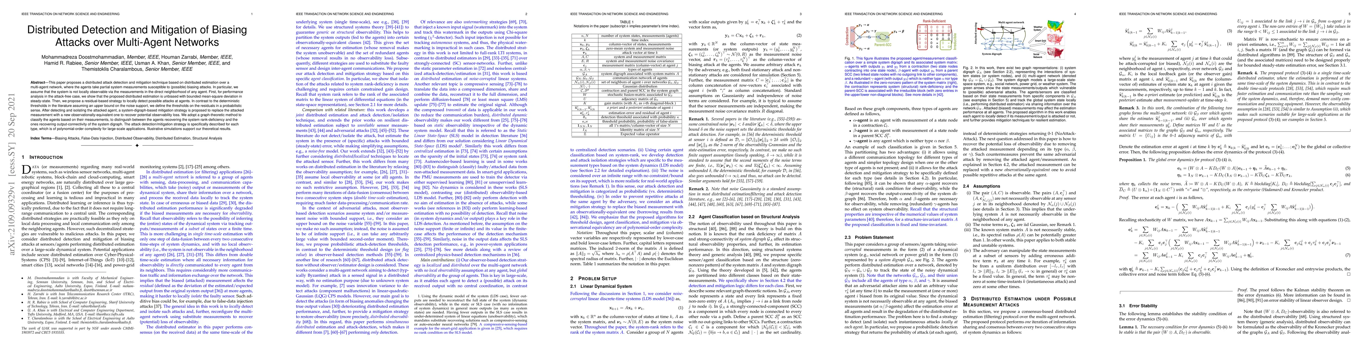 This paper introduces a distributed method for detecting and mitigating biasing attacks in multi-agent networks through distributed estimation, employing probabilistic thresholds for attack detection and a system-digraph-based mitigation strategy to recover observability. Simulations validate the effectiveness of the proposed approach.