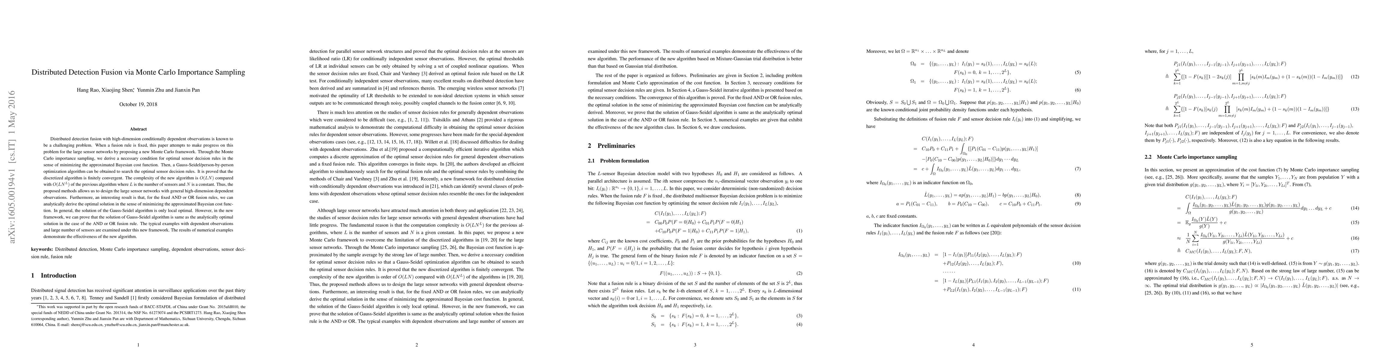 This paper proposes a new Monte Carlo framework for distributed detection fusion in large sensor networks with high-dimensional dependent observations, reducing complexity from O(LN^L) to O(LN) while achieving optimal solutions for AND or OR fusion rules.