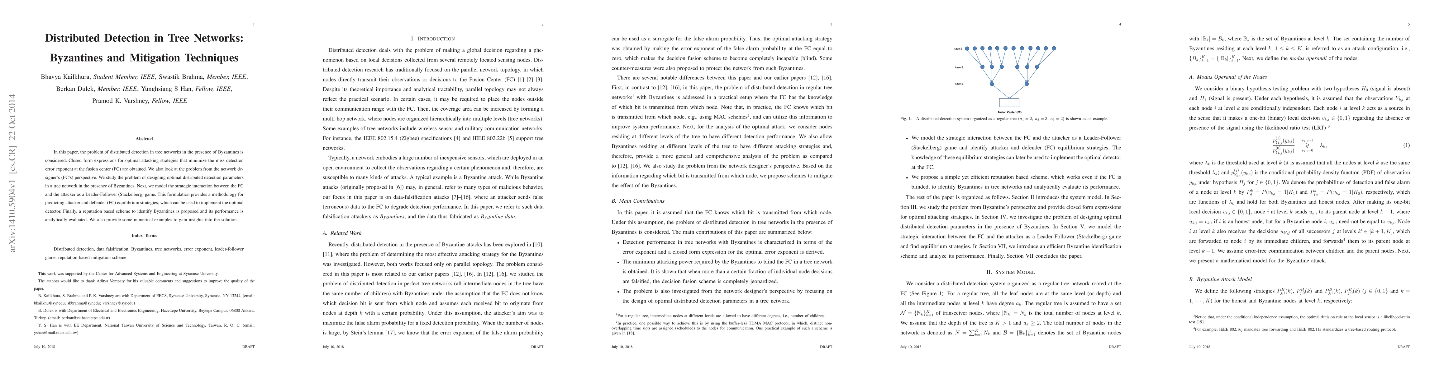 This paper investigates distributed detection in tree networks with Byzantine nodes, deriving optimal attacking strategies and designing parameters for the fusion center. It models the interaction between the fusion center and the attacker as a Stackelberg game to predict equilibrium strategies and proposes a reputation-based scheme to identify Byzantines.