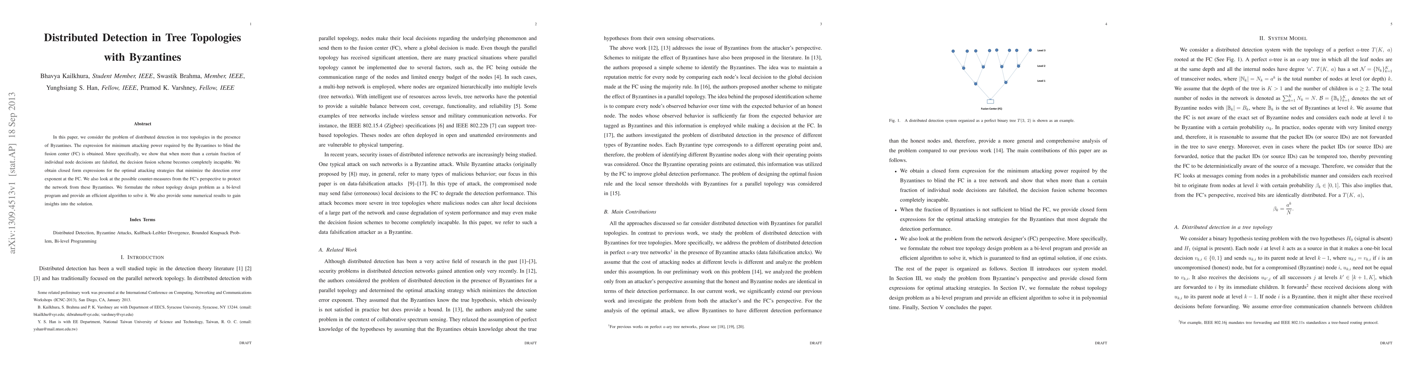 In this paper, we consider the problem of distributed detection in tree topologies in the presence of Byzantines. The expression for minimum attacking power required by the Byzantines to blind the fusion center (FC) is obtained. More specifically, we show that when more than a certain fraction of individual node decisions are falsified, the decision fusion scheme becomes completely incapable. We obtain closed form expressions for the optimal attacking strategies that minimize the detection error exponent at the FC. We also look at the possible counter-measures from the FC's perspective to protect the network from these Byzantines. We formulate the robust topology design problem as a bi-level program and provide an efficient algorithm to solve it. We also provide some numerical results to gain insights into the solution.