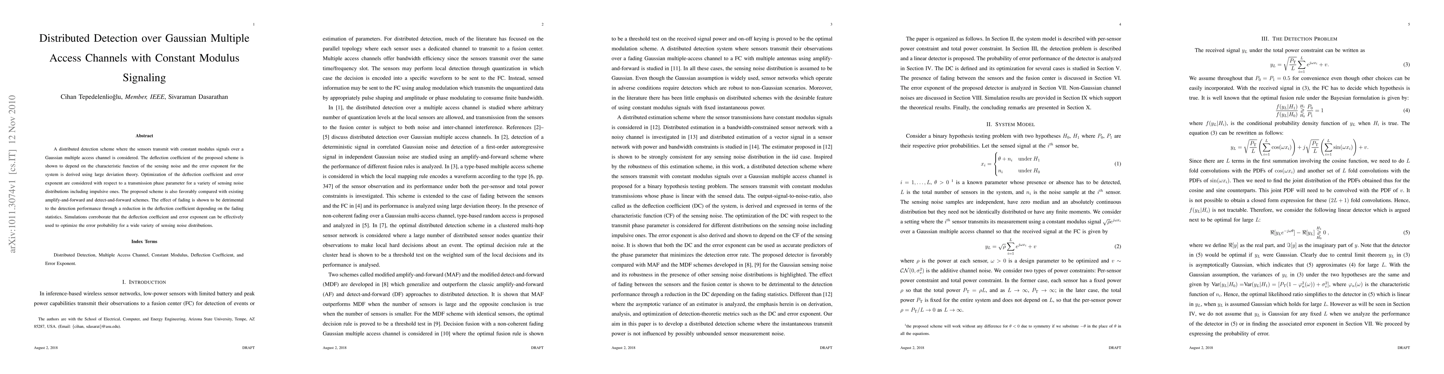 This paper proposes a distributed detection scheme for sensors using constant modulus signaling over Gaussian multiple access channels. The scheme's performance is analyzed through the deflection coefficient and error exponent, optimized with respect to a transmission parameter, and compared to existing methods. Simulations show that the proposed scheme effectively optimizes error probability across various noise distributions, though fading negatively impacts performance.