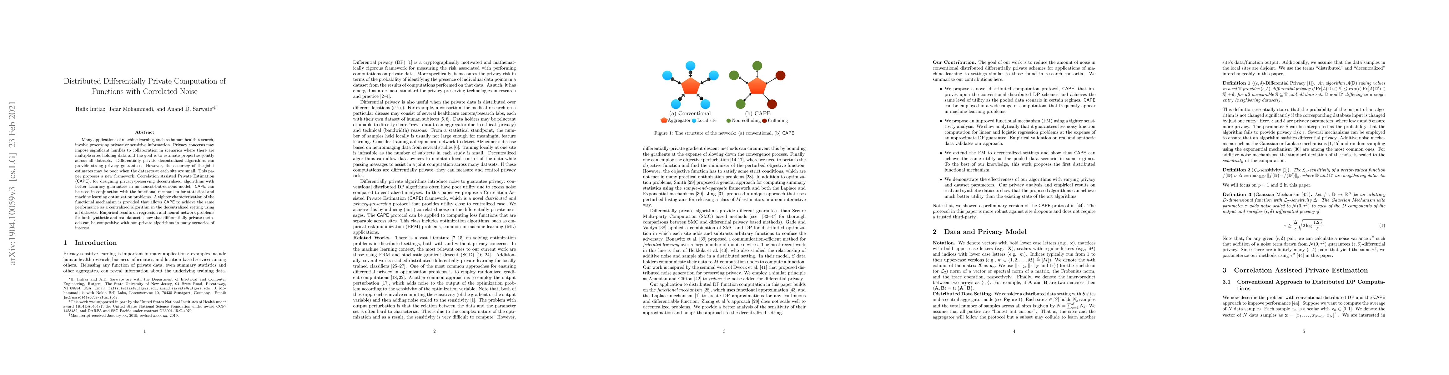 Many applications of machine learning, such as human health research, involve processing private or sensitive information. Privacy concerns may impose significant hurdles to collaboration in scenarios where there are multiple sites holding data and the goal is to estimate properties jointly across all datasets. Differentially private decentralized algorithms can provide strong privacy guarantees. However, the accuracy of the joint estimates may be poor when the datasets at each site are small. This paper proposes a new framework, Correlation Assisted Private Estimation (CAPE), for designing privacy-preserving decentralized algorithms with better accuracy guarantees in an honest-but-curious model. CAPE can be used in conjunction with the functional mechanism for statistical and machine learning optimization problems. A tighter characterization of the functional mechanism is provided that allows CAPE to achieve the same performance as a centralized algorithm in the decentralized setting using all datasets. Empirical results on regression and neural network problems for both synthetic and real datasets show that differentially private methods can be competitive with non-private algorithms in many scenarios of interest.